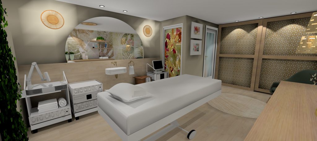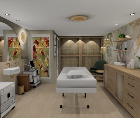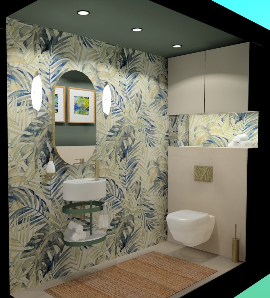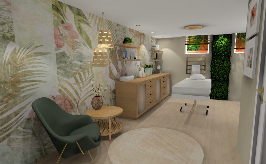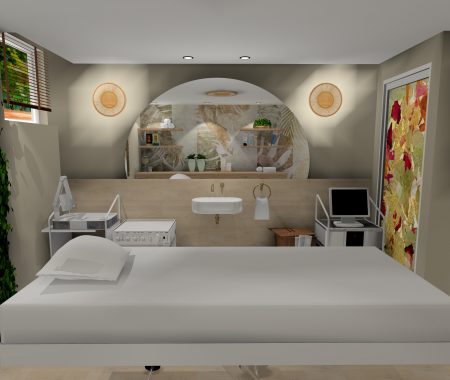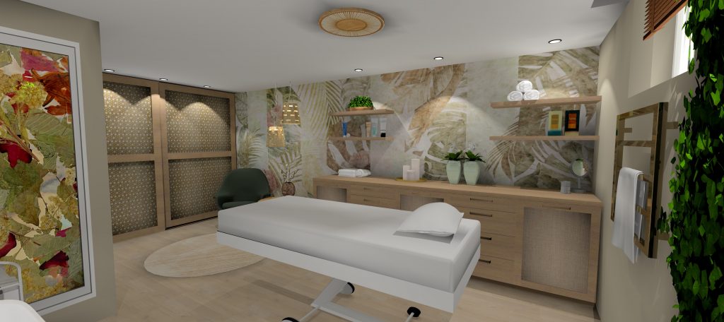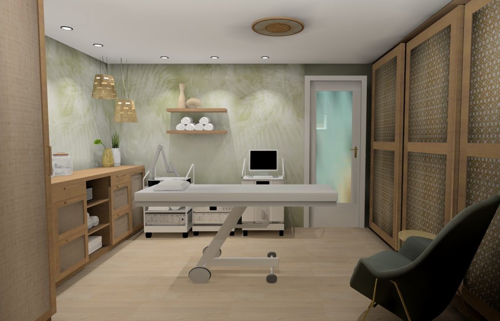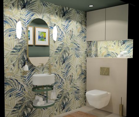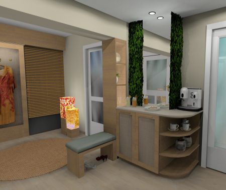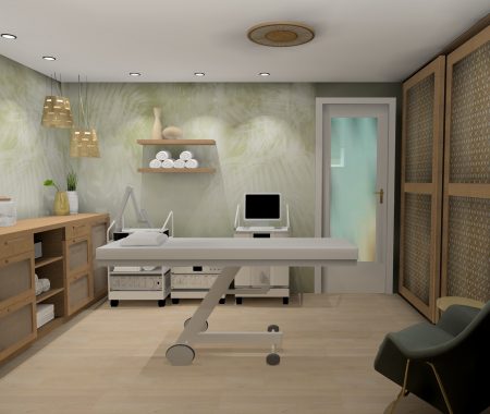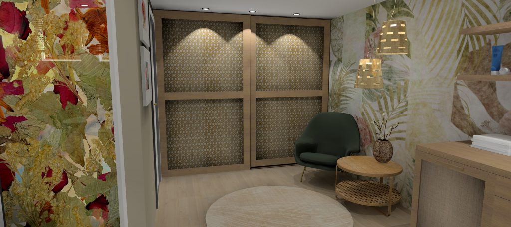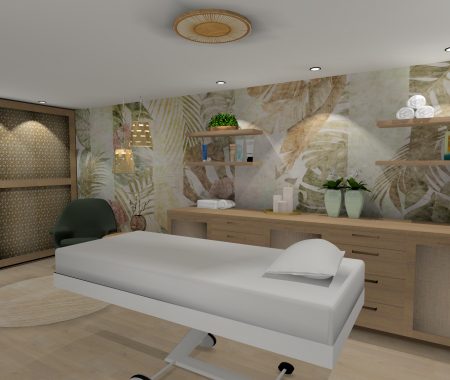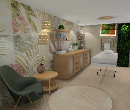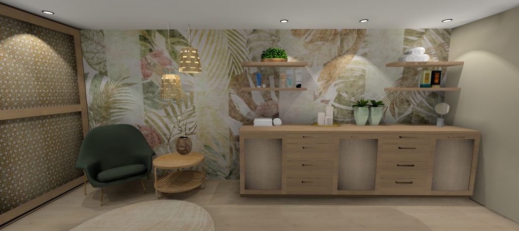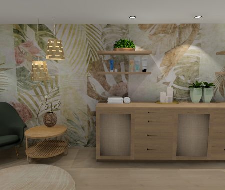 2025ös tervezés, melynek kivitelezése jelenleg zajlik. Megrendelőm szépségszalont vezető kozmetikus, aki két kezelő helyiség, egy hangulatos váró és egy vendégmosdó tervezéssel bízott meg, méghozzá balinéz stílusban. Örültem ennek a ritkán kért stílusválasztásnak, mert egy töltődéssel, szépüléssel, rekreációval foglalkozó szolgáltatásnak egy ilyen természetközeli irányzat választása igen meggyőző. A terekben a természetes anyagokat részesítettük előnyben, mint például a rattan felületeket, vászon anyagokat, növényi laminátumokat, konkrét zuzmó falat, a háncsból készült lámpákat, növényi mintás tapétákat, a kiegészítő szín pedig természetesen a zöld volt.