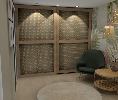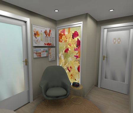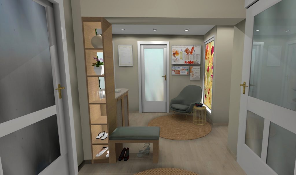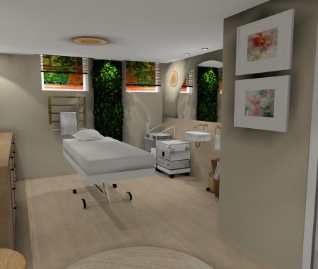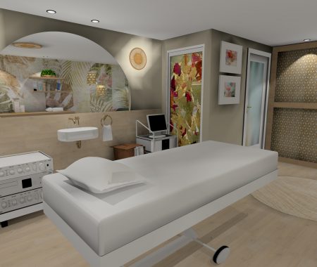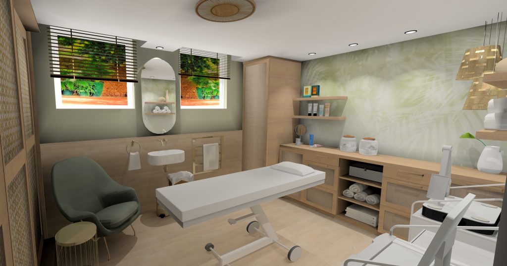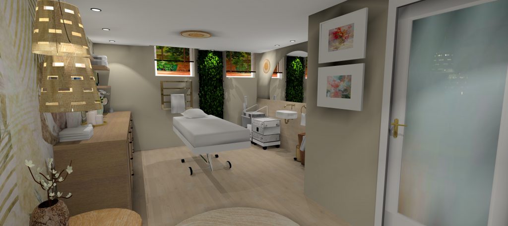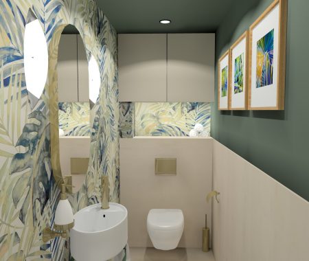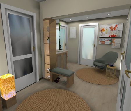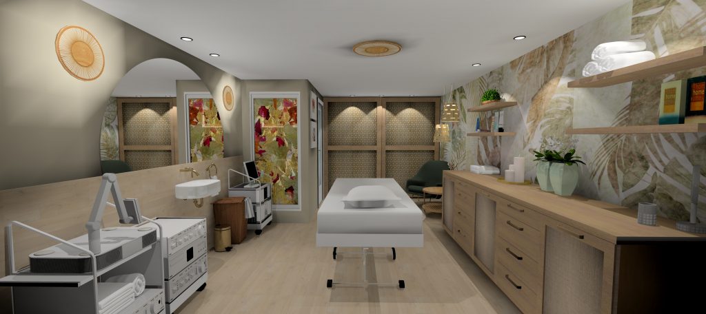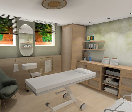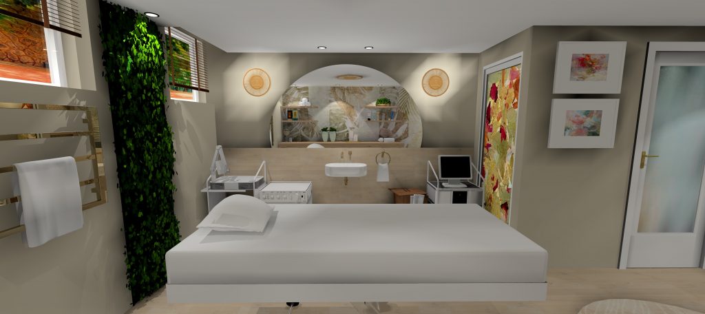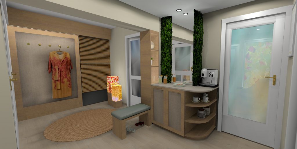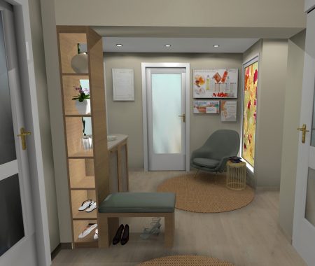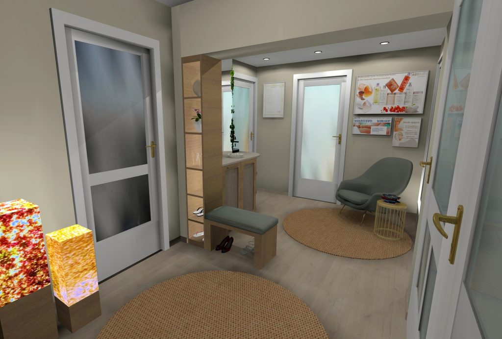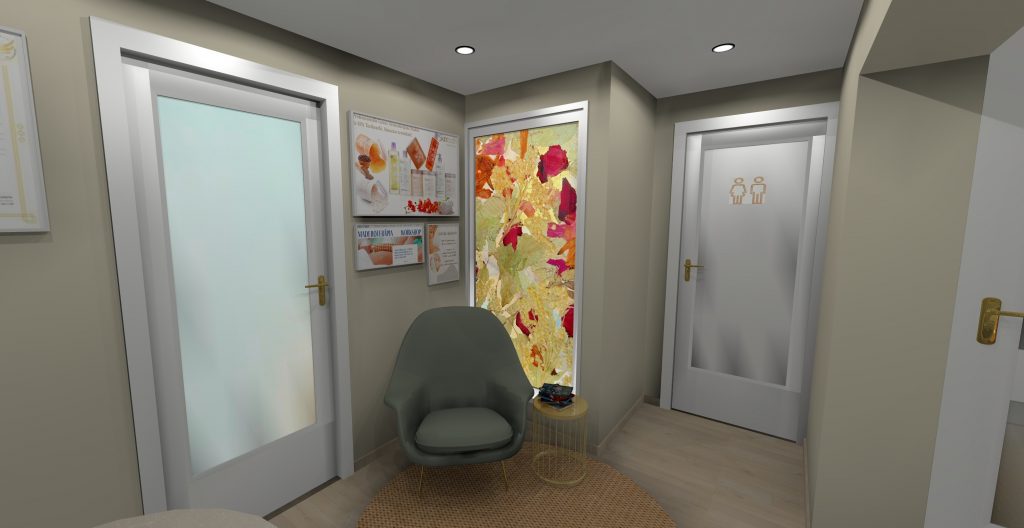 2025ös tervezés, melynek kivitelezése jelenleg zajlik. Megrendelőm szépségszalont vezető kozmetikus, aki két kezelő helyiség, egy hangulatos váró és egy vendégmosdó tervezéssel bízott meg, méghozzá balinéz stílusban. Örültem ennek a ritkán kért stílusválasztásnak, mert egy töltődéssel, szépüléssel, rekreációval foglalkozó szolgáltatásnak egy ilyen természetközeli irányzat választása igen meggyőző. A terekben a természetes anyagokat részesítettük előnyben, mint például a rattan felületeket, vászon anyagokat, növényi laminátumokat, konkrét zuzmó falat, a háncsból készült lámpákat, növényi mintás tapétákat, a kiegészítő szín pedig természetesen a zöld volt.