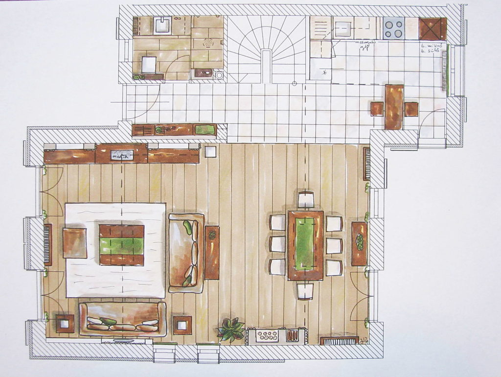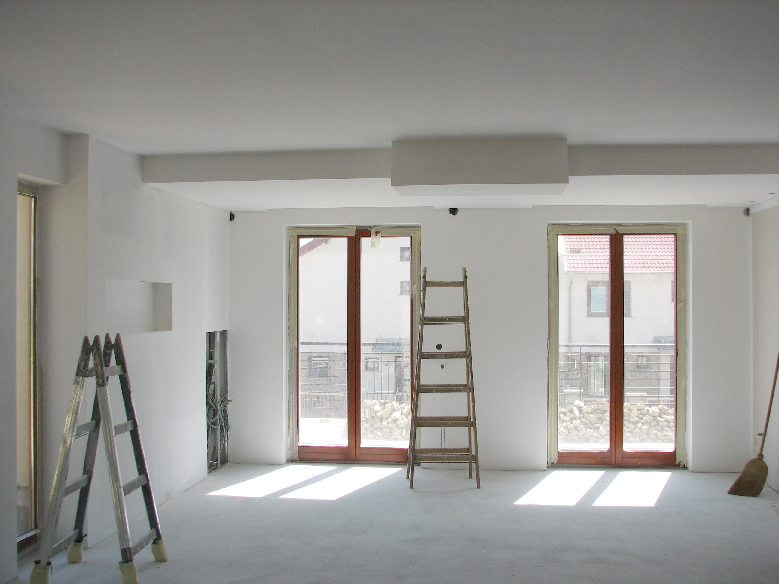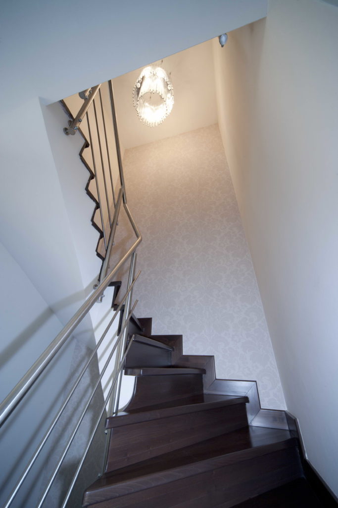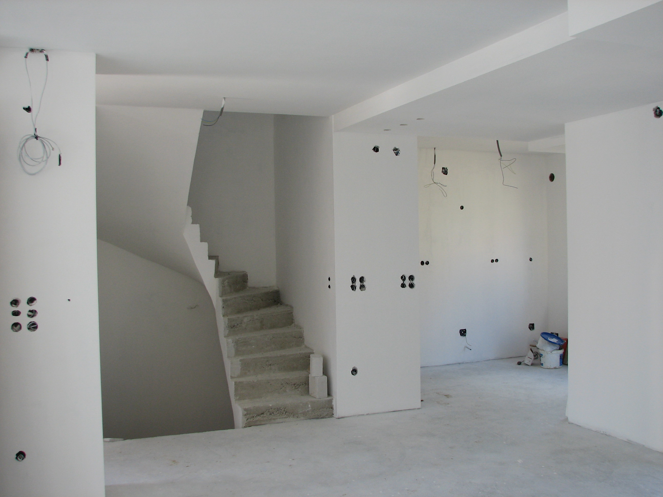 A lépcső tér nagyon tetszik már így is; szép lendülete van a két lépcsőkarnak. Mellette már a konyha alakul.