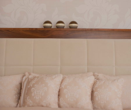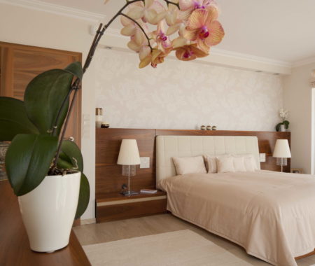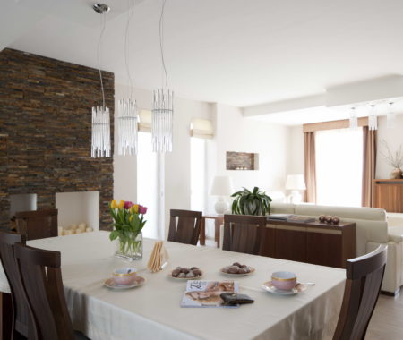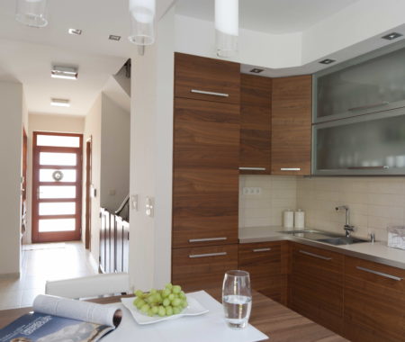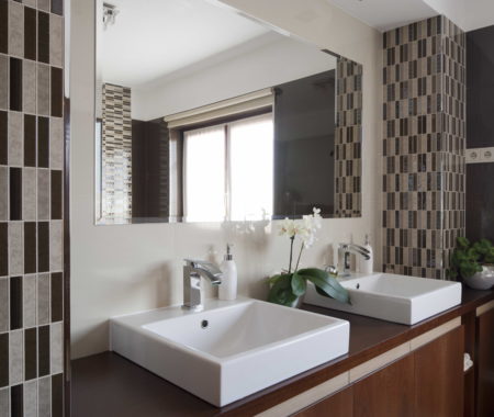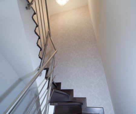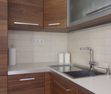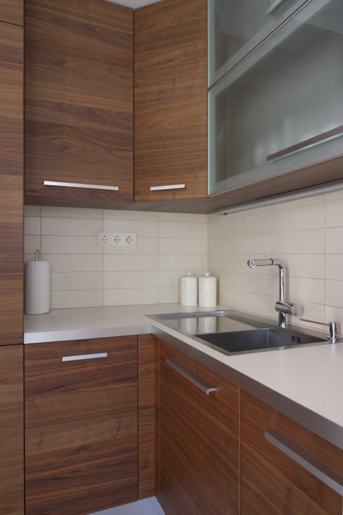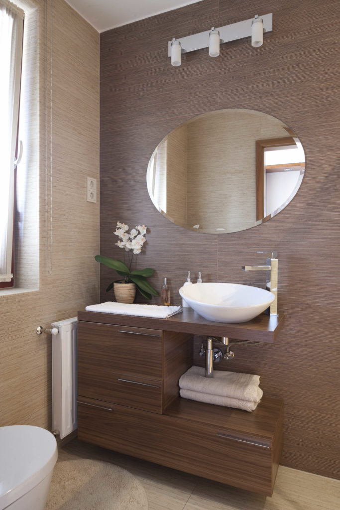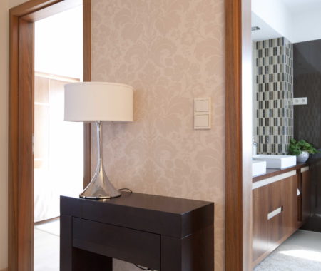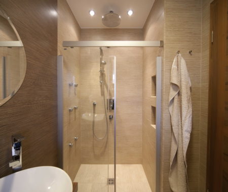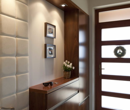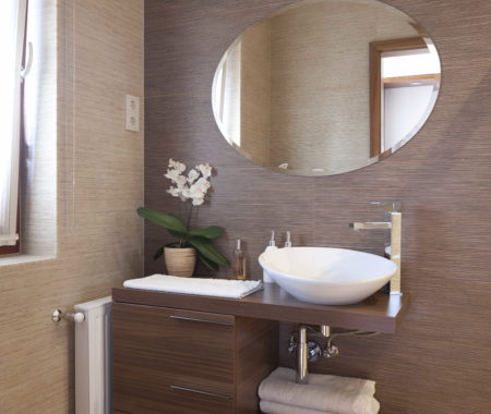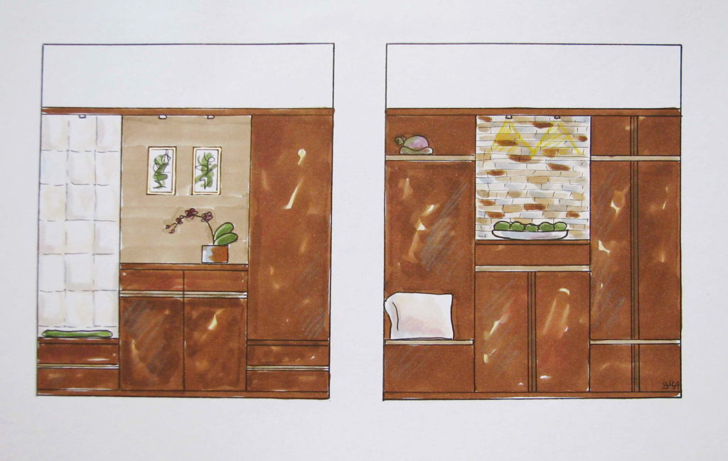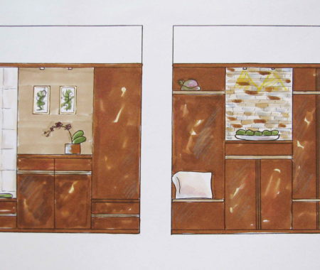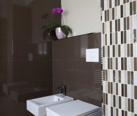 Ügyfelem minimál stílust képzelt el otthonában, de nem a steril, rideg verzióját, hanem barátságosan, elegánsan. Ezek alapján vetettük el a minimálnál kézenfekvő sötét wenge felületeket, és inkább egy melegebb, időtállóbb fát, a cseresznyét választottuk, amit sokszor méltatlanul mellőznek, kissé konzervatív hangulata miatt. Ennek elkerülése végett modern, egyenes vonalú, letisztult vonalvezetésű bútorokat terveztem, minimumra csökkentve a részleteket. Továbbá természetes palakővel, bronzos kiegészítőkkel, mozaikokkal és finom tapétával gazdagítottuk a látványt.