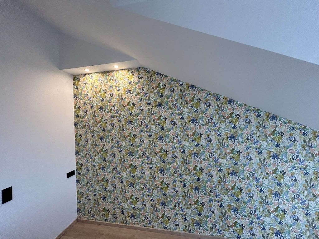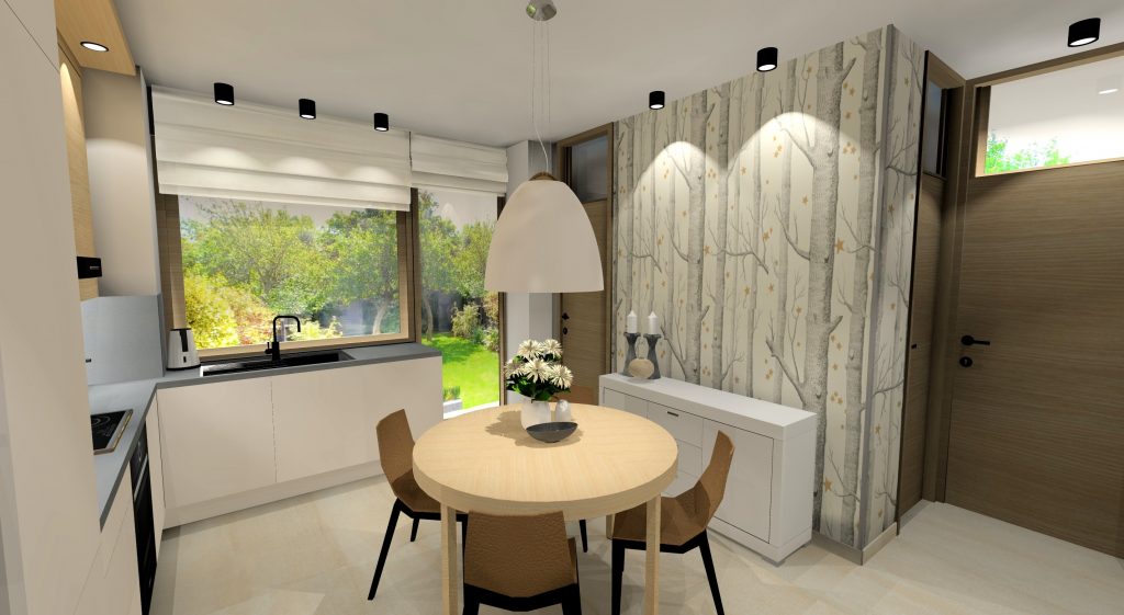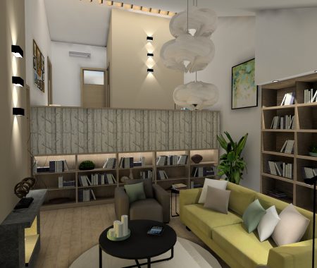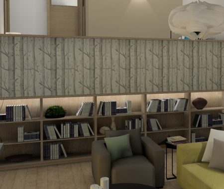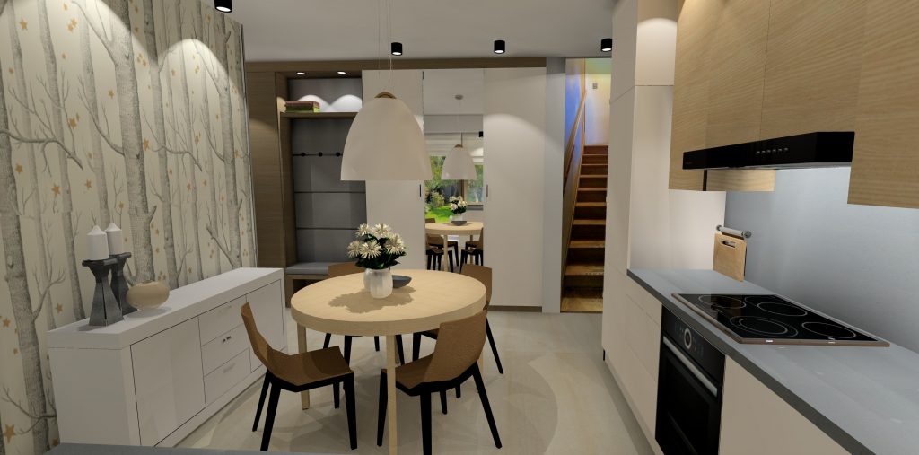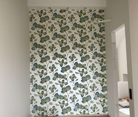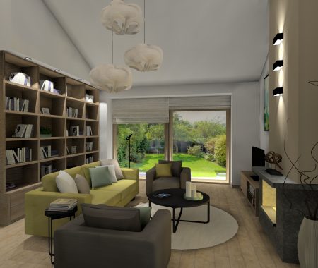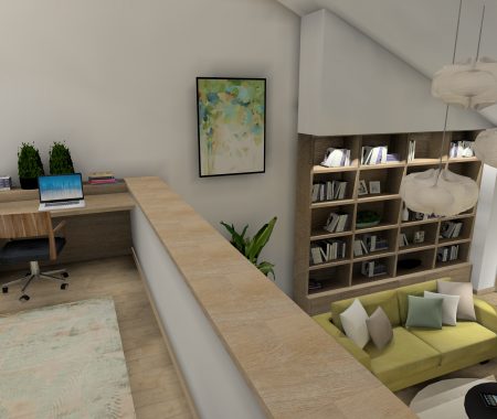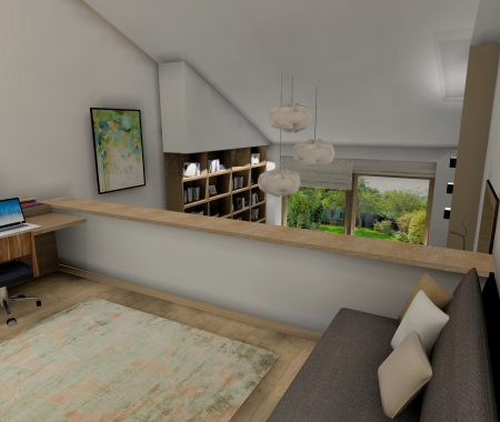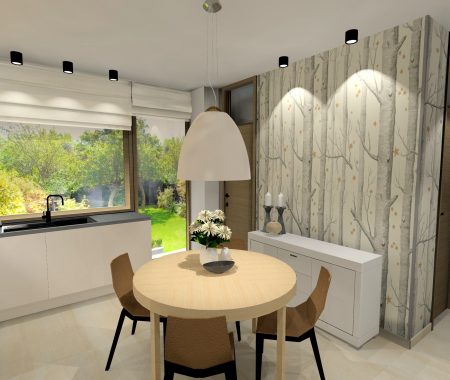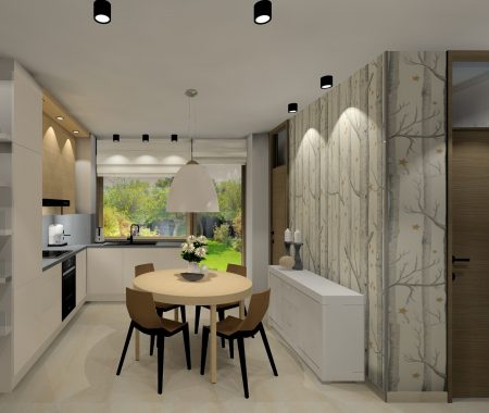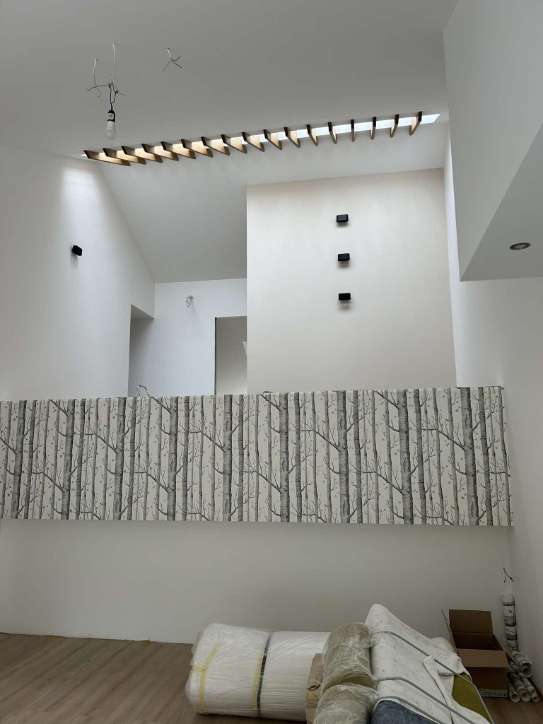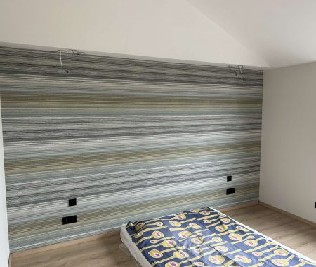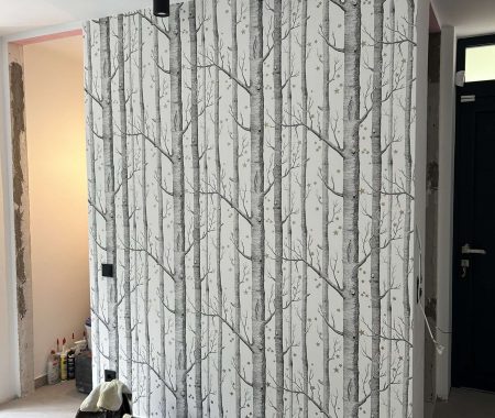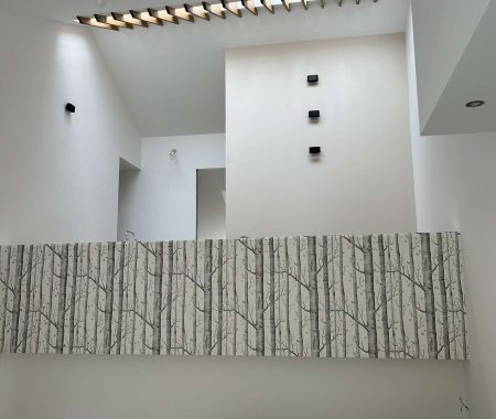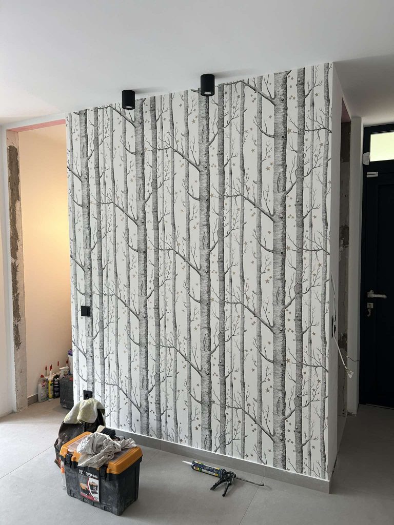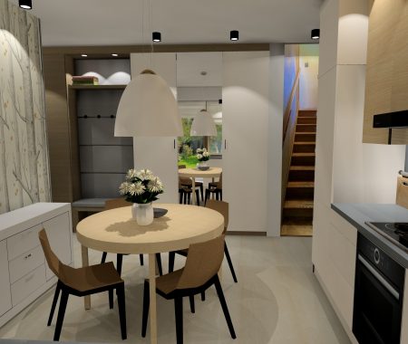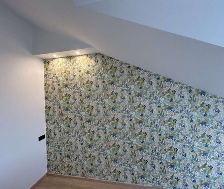 Rózsadomb tetején egy 70-es években épült belső kétszintes sorházi lakás tervezése volt a feladat egy házaspárnak, két kislánnyal. A skandináv stílust választották, halvány zöldekkel, natúr fával és fekete kiegészítőkkel. A fő motívum a Fornasetti egyik legismertebb mintájú tapétája volt; a Woods, melyen apró arany csillagok is láthatóak. Szépen egészítette ki a skandináv fekete-fehér motívumokat.