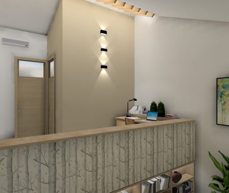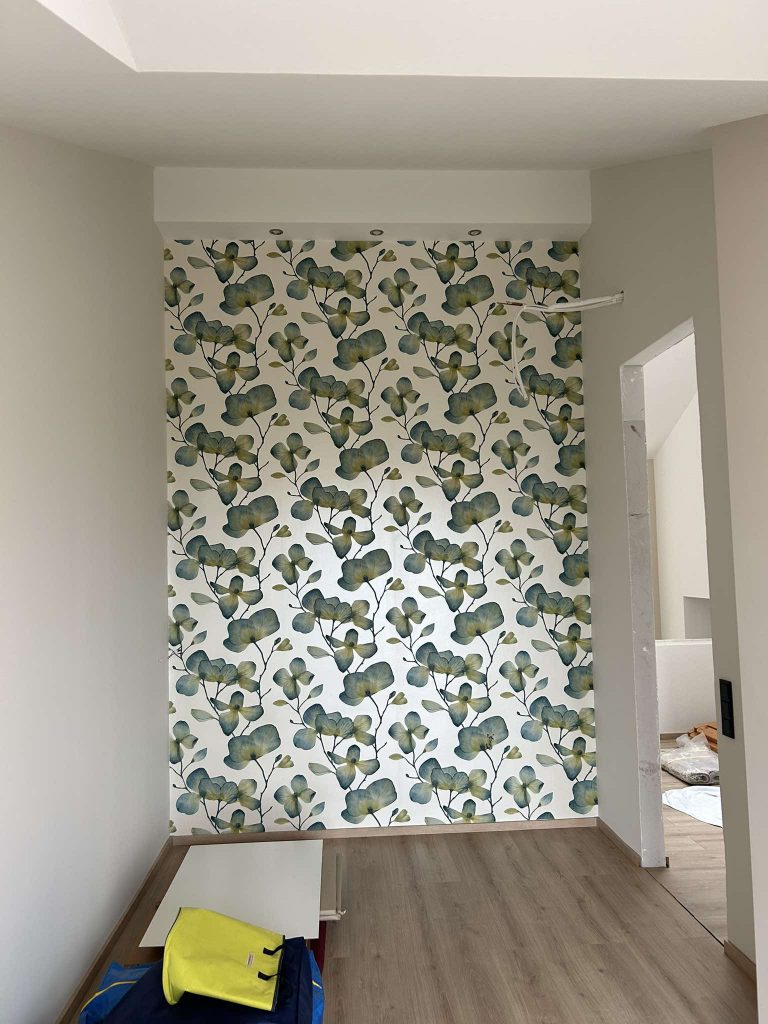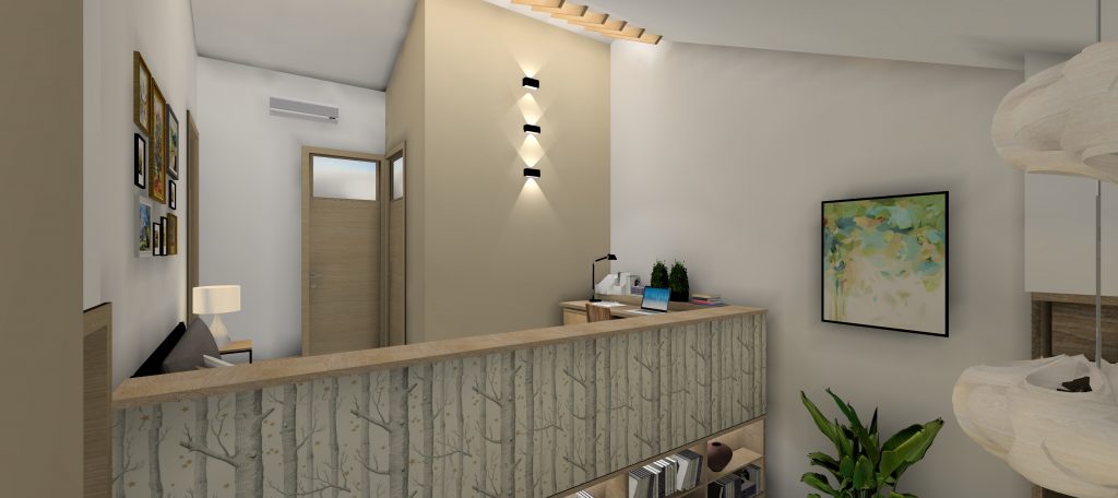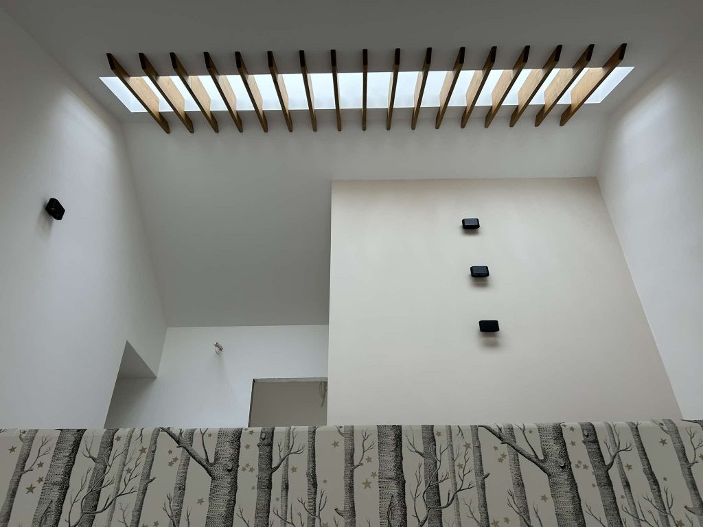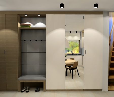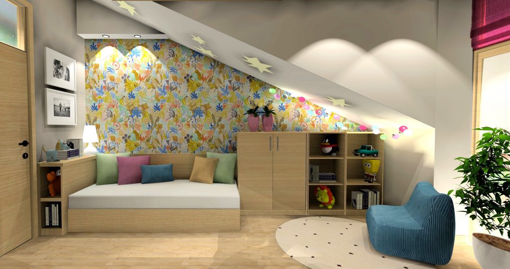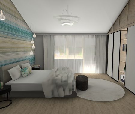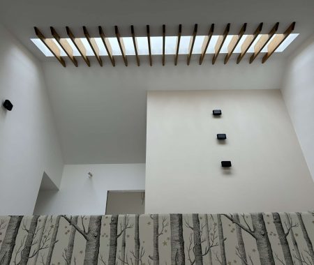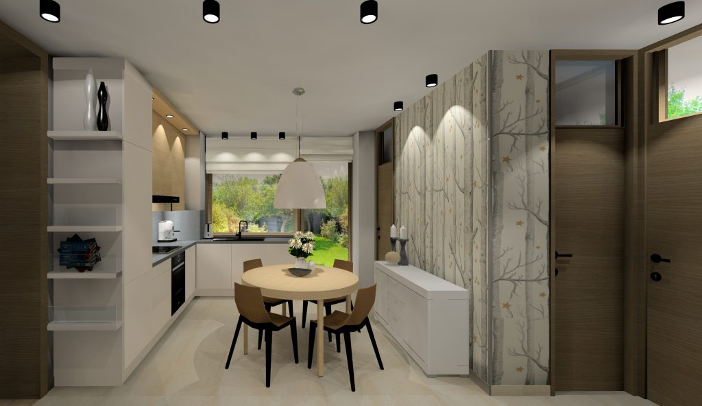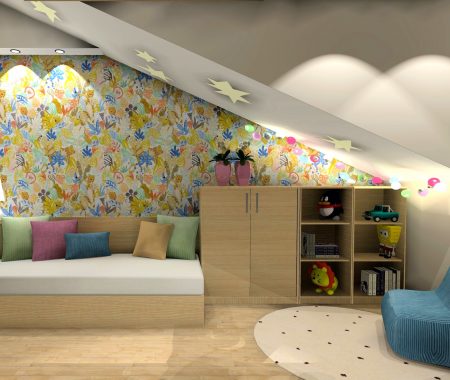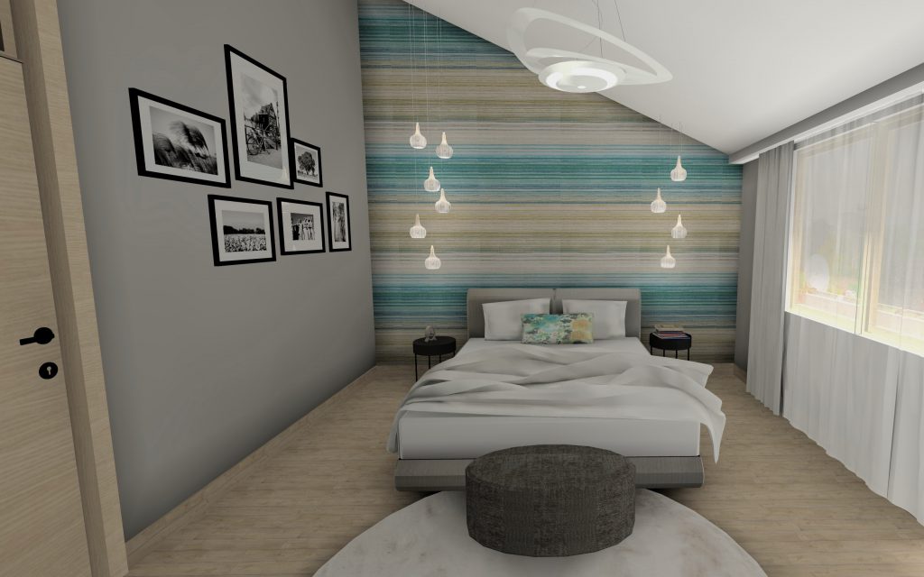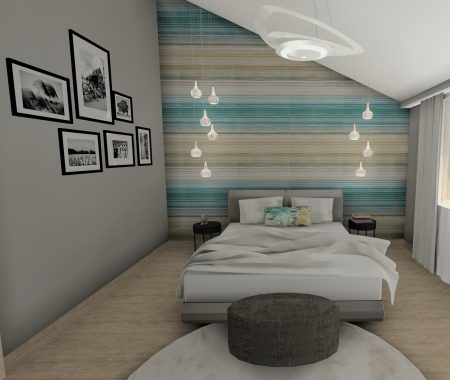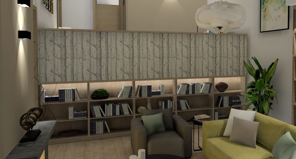 Rózsadomb tetején egy 70-es években épült belső kétszintes sorházi lakás tervezése volt a feladat egy házaspárnak, két kislánnyal. A skandináv stílust választották, halvány zöldekkel, natúr fával és fekete kiegészítőkkel. A fő motívum a Fornasetti egyik legismertebb mintájú tapétája volt; a Woods, melyen apró arany csillagok is láthatóak. Szépen egészítette ki a skandináv fekete-fehér motívumokat.