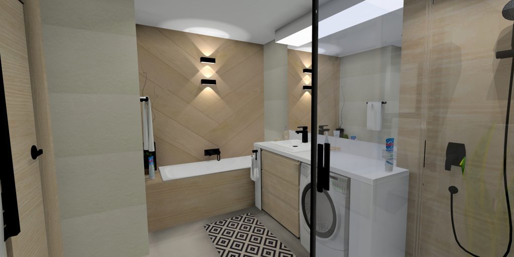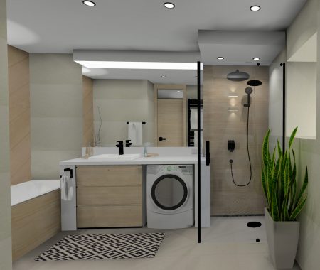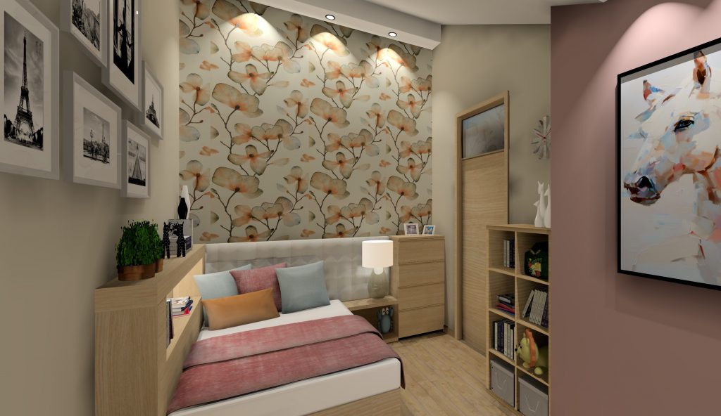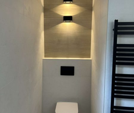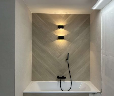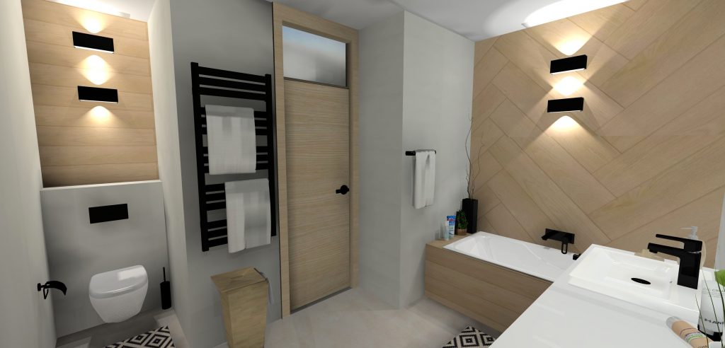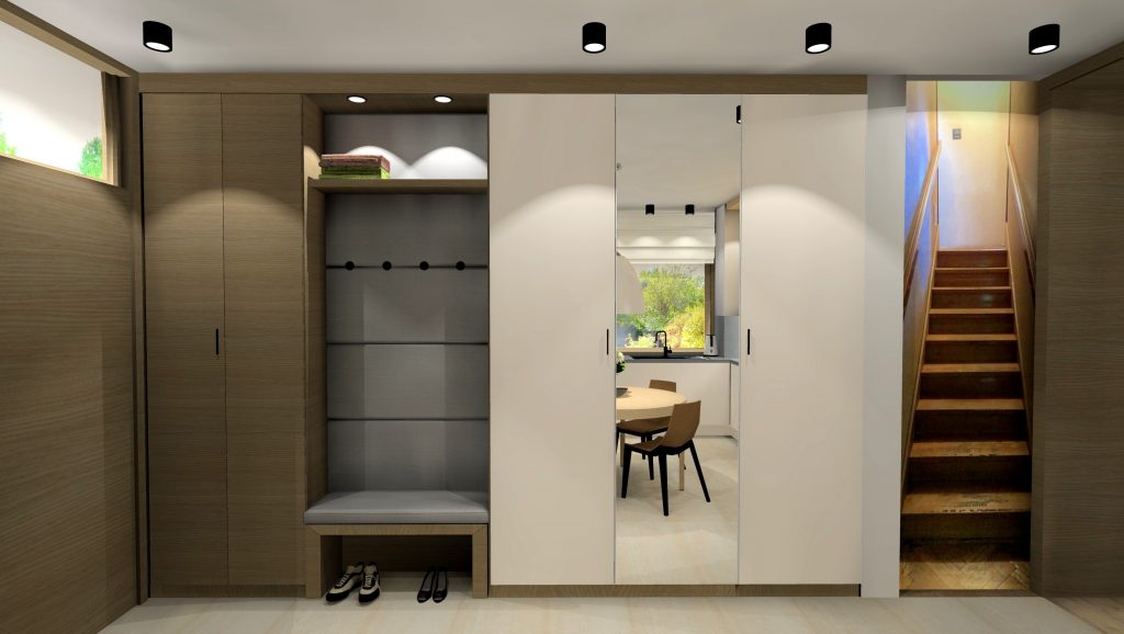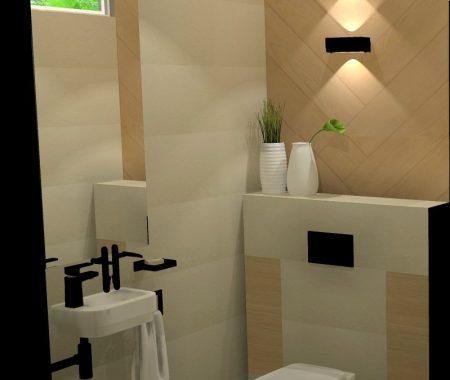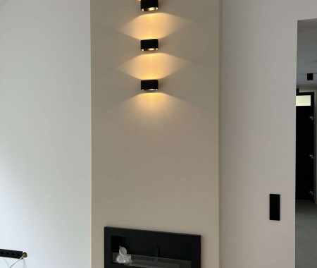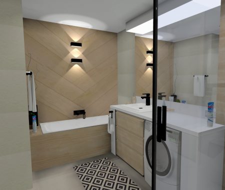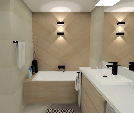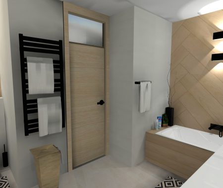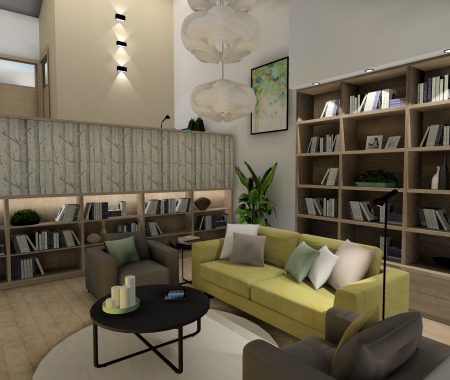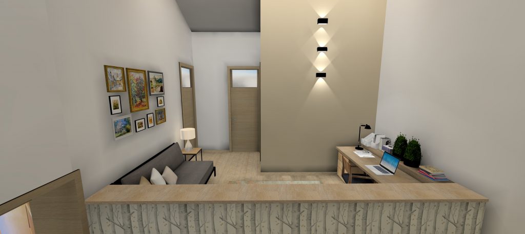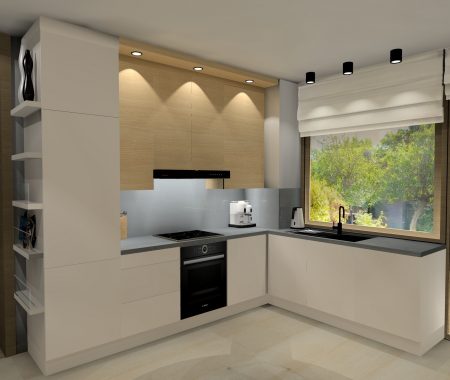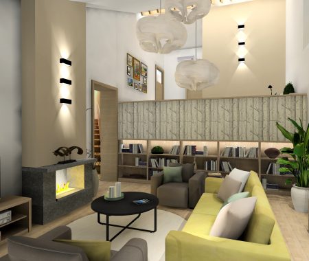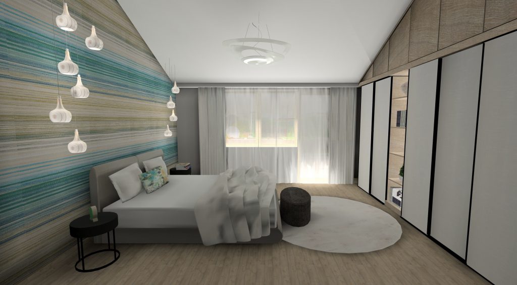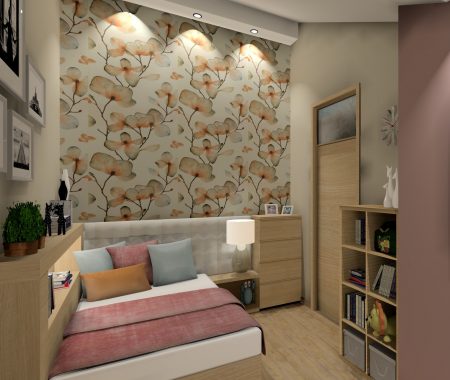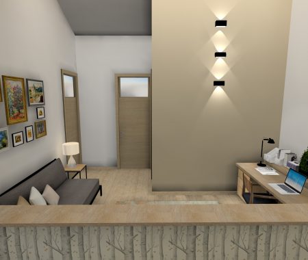 Rózsadomb tetején egy 70-es években épült belső kétszintes sorházi lakás tervezése volt a feladat egy házaspárnak, két kislánnyal. A skandináv stílust választották, halvány zöldekkel, natúr fával és fekete kiegészítőkkel. A fő motívum a Fornasetti egyik legismertebb mintájú tapétája volt; a Woods, melyen apró arany csillagok is láthatóak. Szépen egészítette ki a skandináv fekete-fehér motívumokat.