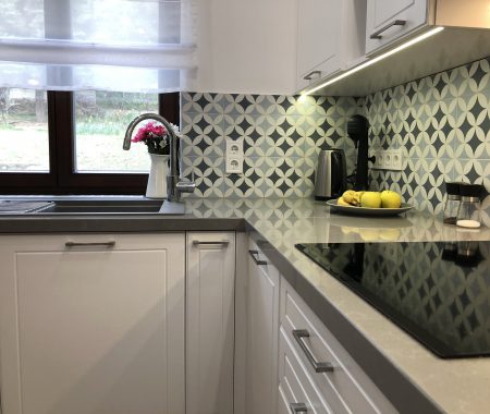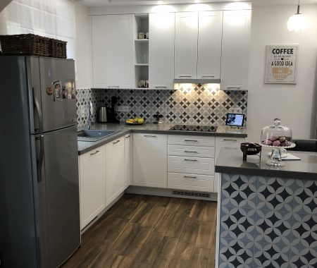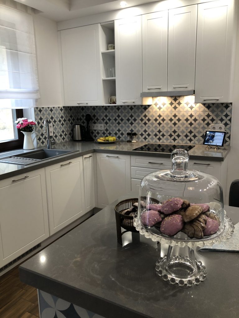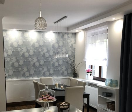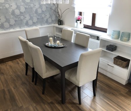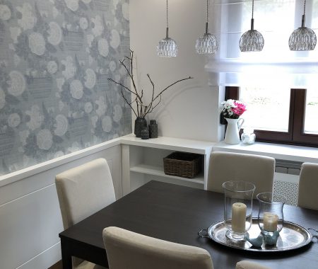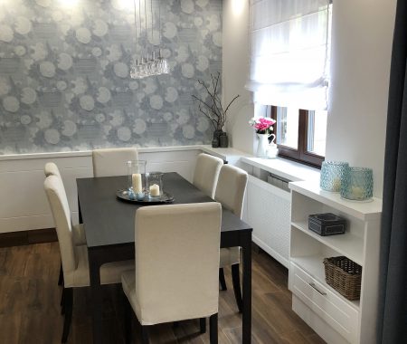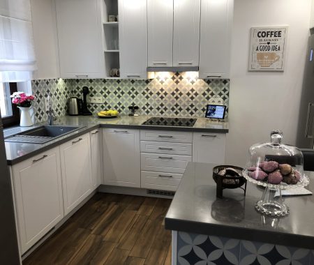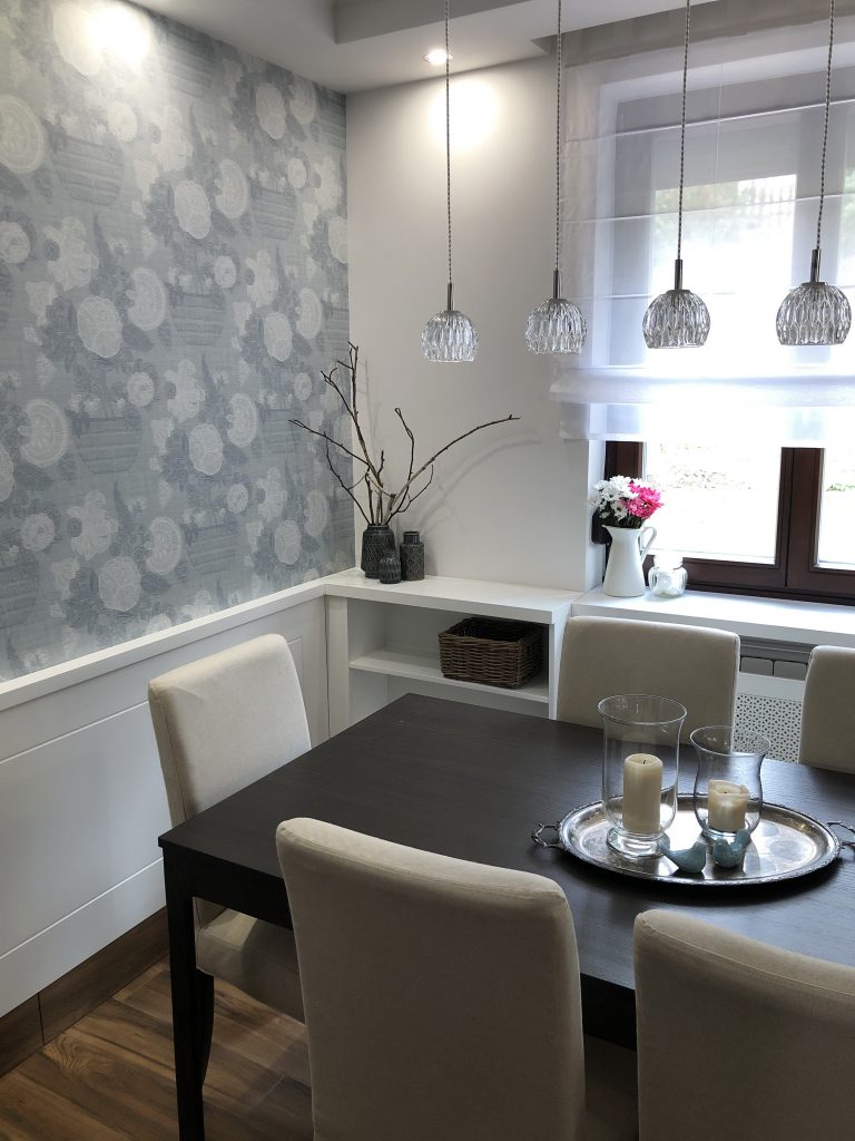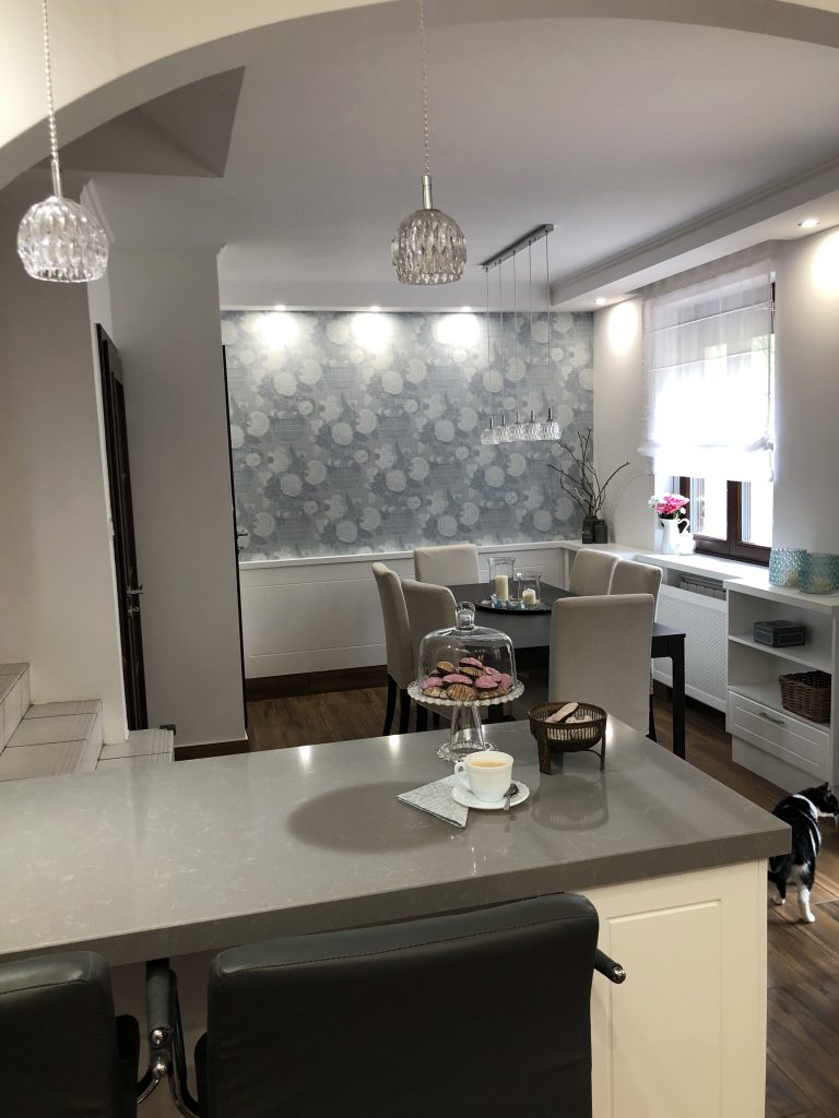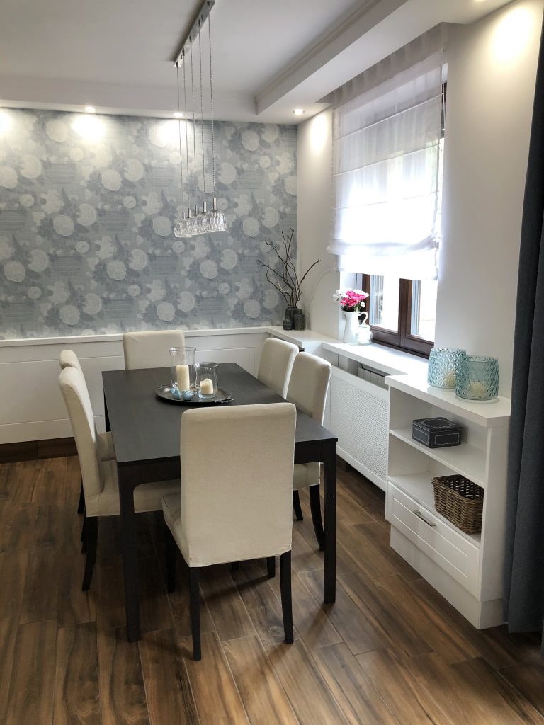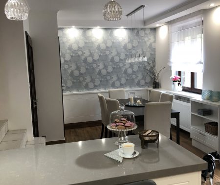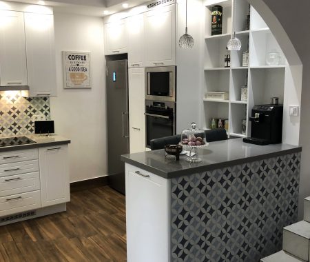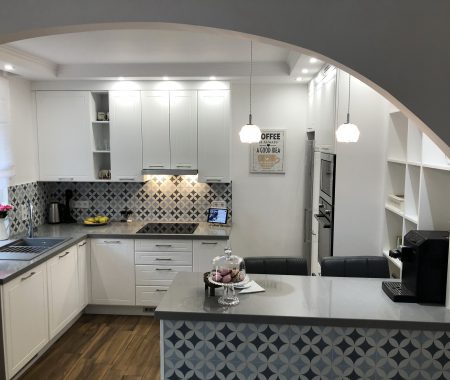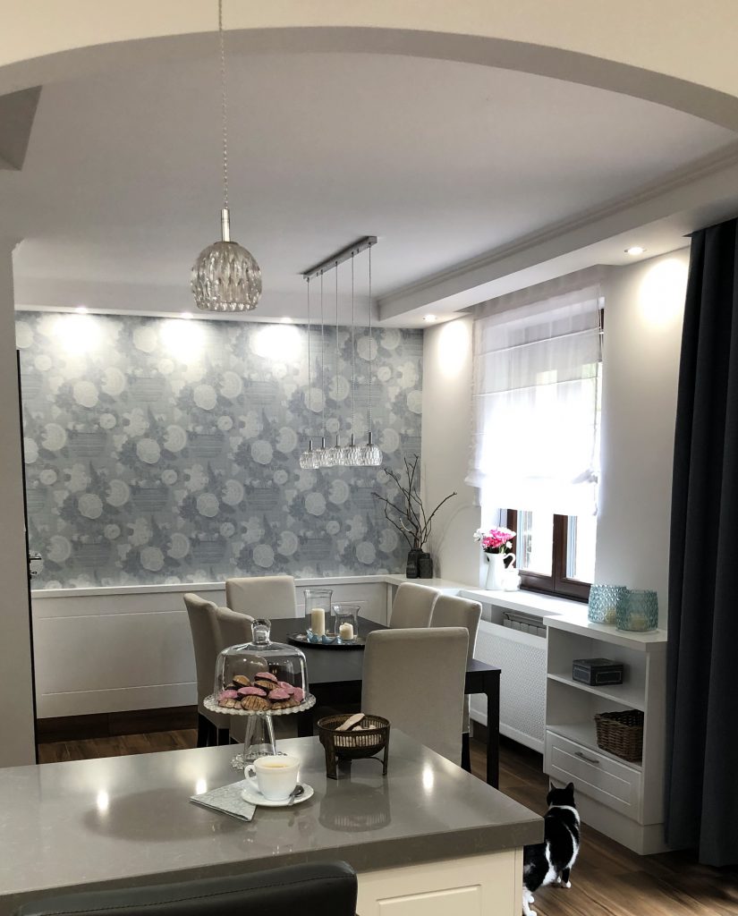 Egy konyha-étkező felújítása volt a feladat. Az ügyfelek egy időtlen, klasszikusba hajló stílust kértek, fehér keretbetétes frontokkal, cementlap mintájú fali lapokkal. A tulajdonosok hidegburkolatot kértek ebbe a térbe, de hogy ne legyen nagyon rideg fahatású burkolatot választottunk. Továbbá tapétát használtam az étkezőbe, egyrészt mert imádom őket, másrészt hogy ez is lágyítsa, szobaszerűbbé tegye az étkezőrészt. 2 macska is tartozik a családhoz, ezért miattuk nem lehetett földig engedni a tapétát, mert lekarmolták volna. Egy klasszikus, keretes falipanel került ide védőfelületnek, és a tapéta csak erről indult felfelé.