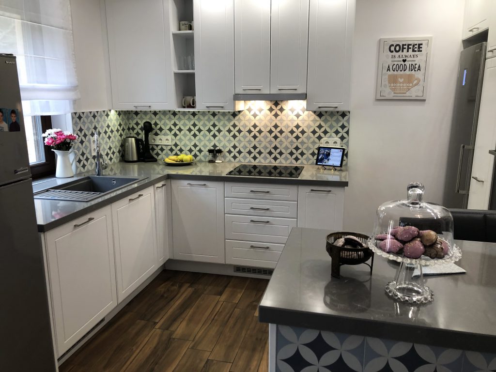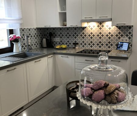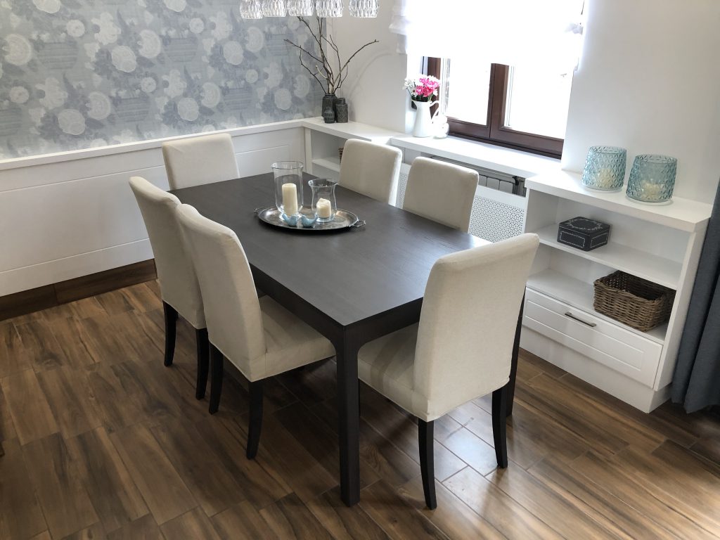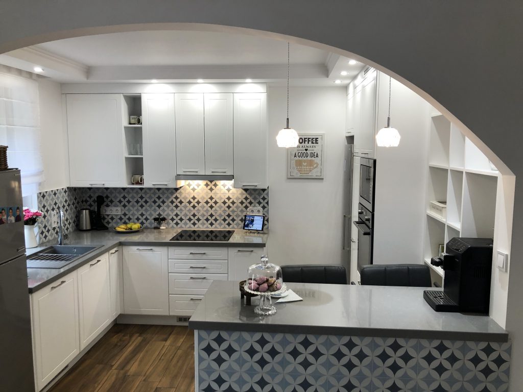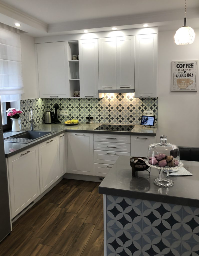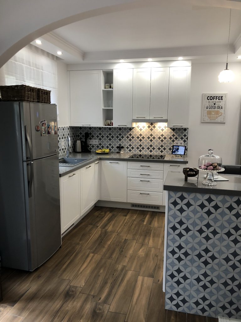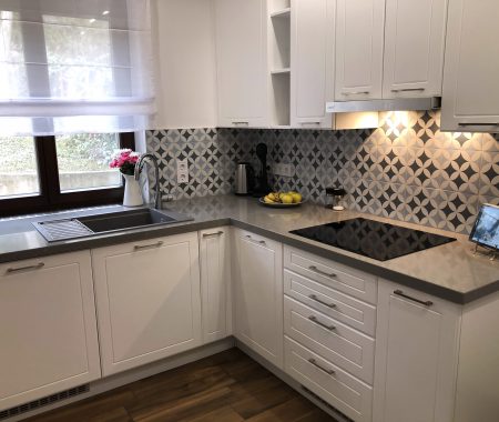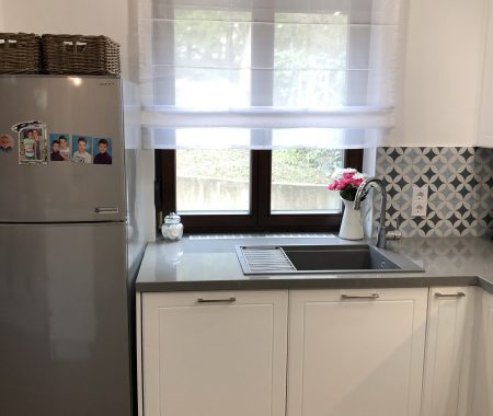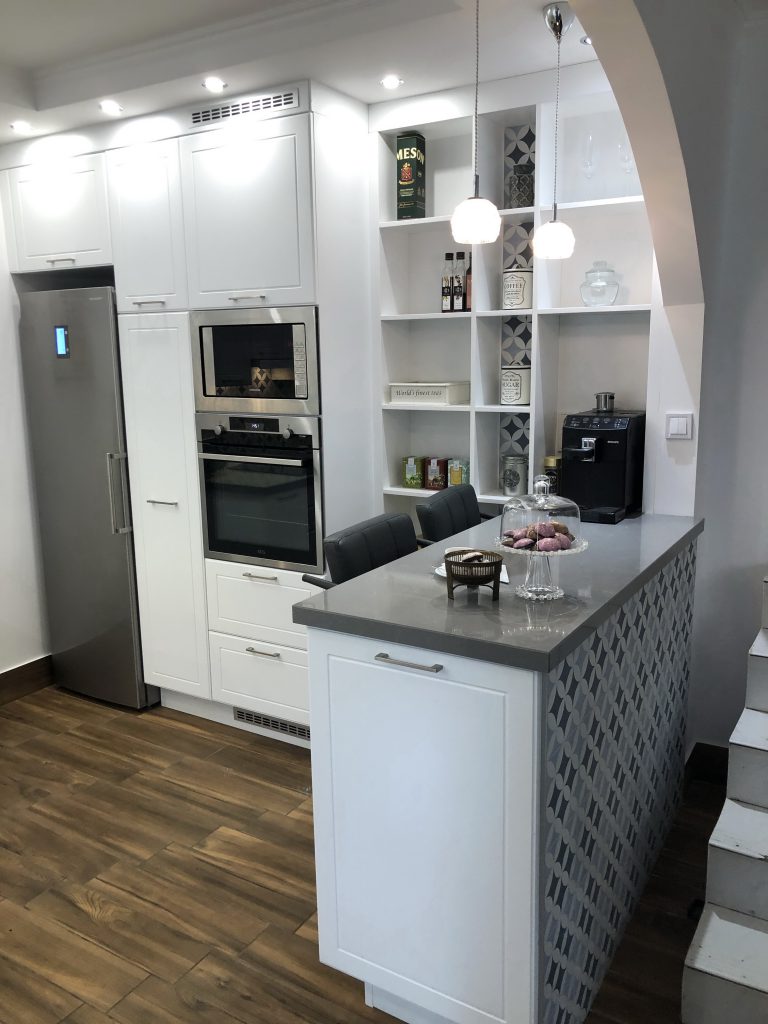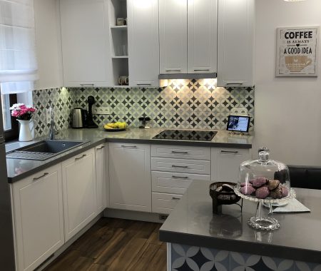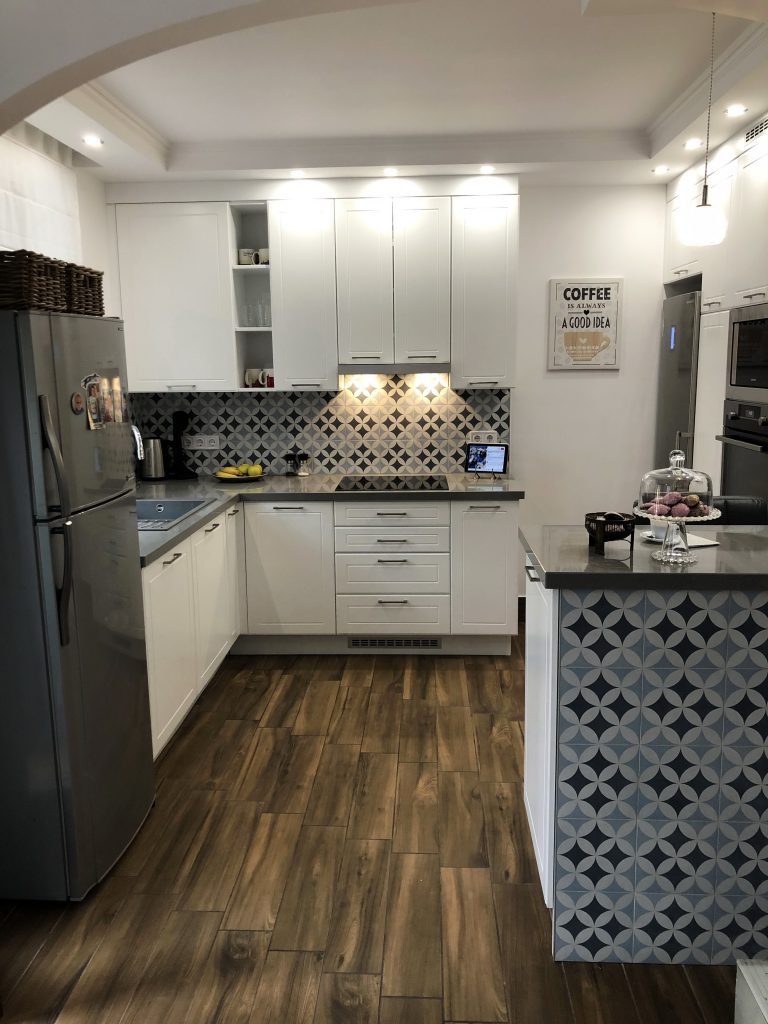 Egy konyha-étkező felújítása volt a feladat. Az ügyfelek egy időtlen, klasszikusba hajló stílust kértek, fehér keretbetétes frontokkal, cementlap mintájú fali lapokkal. A tulajdonosok hidegburkolatot kértek ebbe a térbe, de hogy ne legyen nagyon rideg fahatású burkolatot választottunk. Továbbá tapétát használtam az étkezőbe, egyrészt mert imádom őket, másrészt hogy ez is lágyítsa, szobaszerűbbé tegye az étkezőrészt. 2 macska is tartozik a családhoz, ezért miattuk nem lehetett földig engedni a tapétát, mert lekarmolták volna. Egy klasszikus, keretes falipanel került ide védőfelületnek, és a tapéta csak erről indult felfelé.