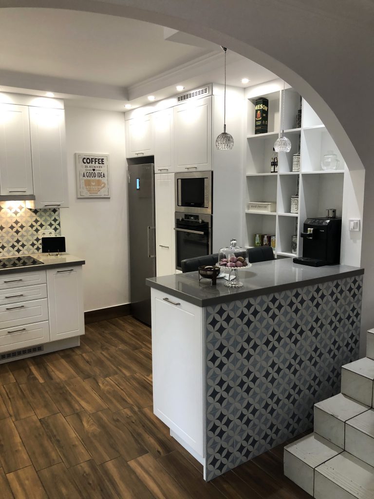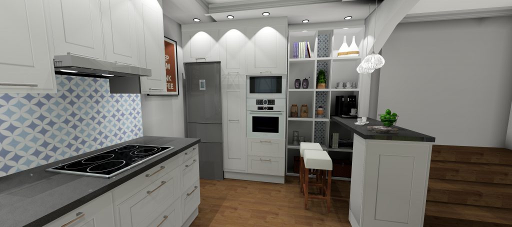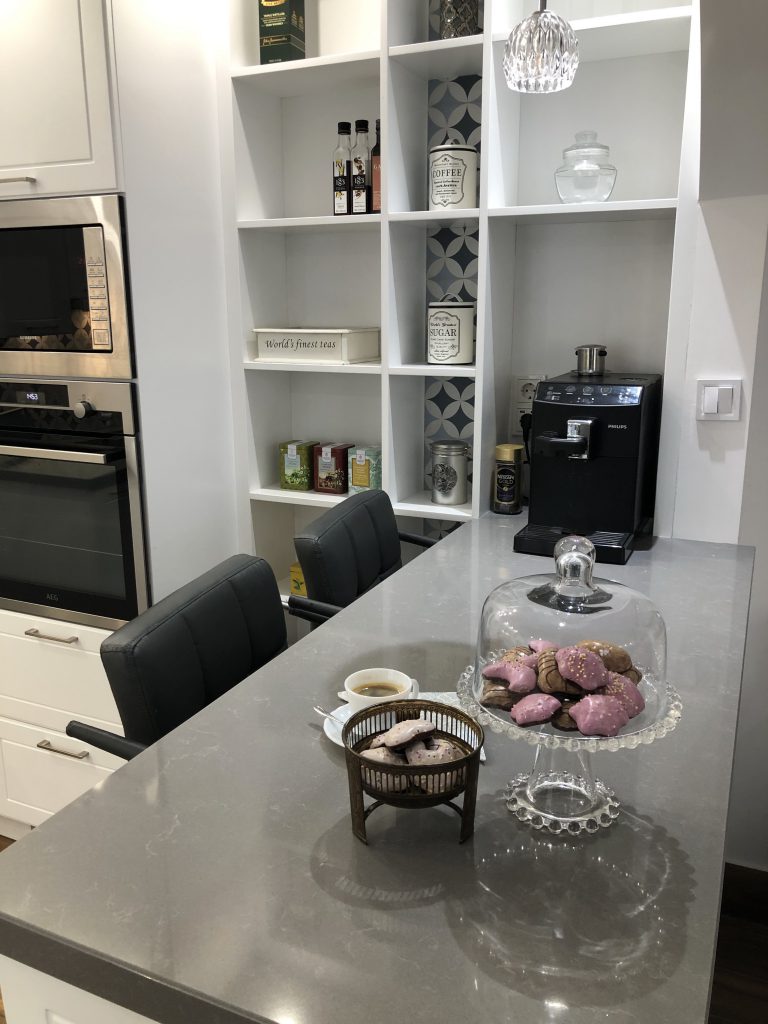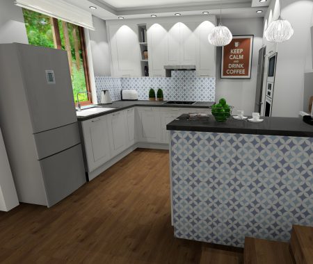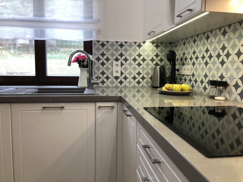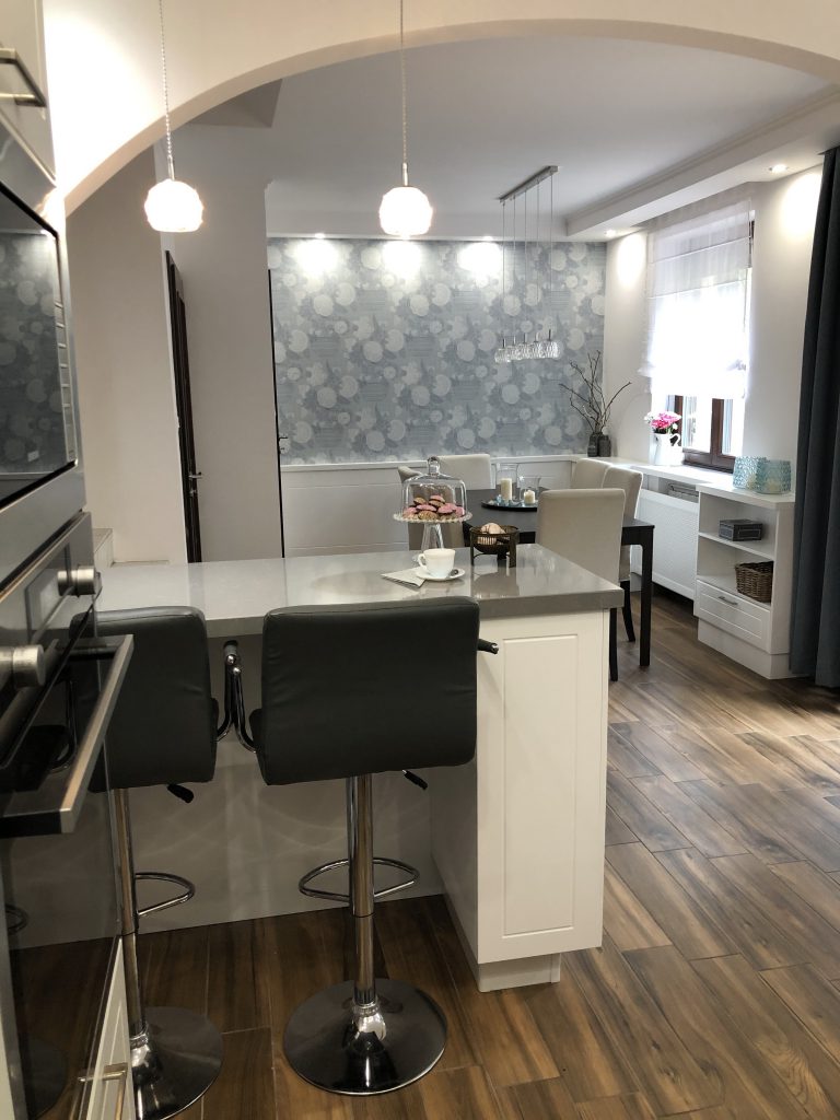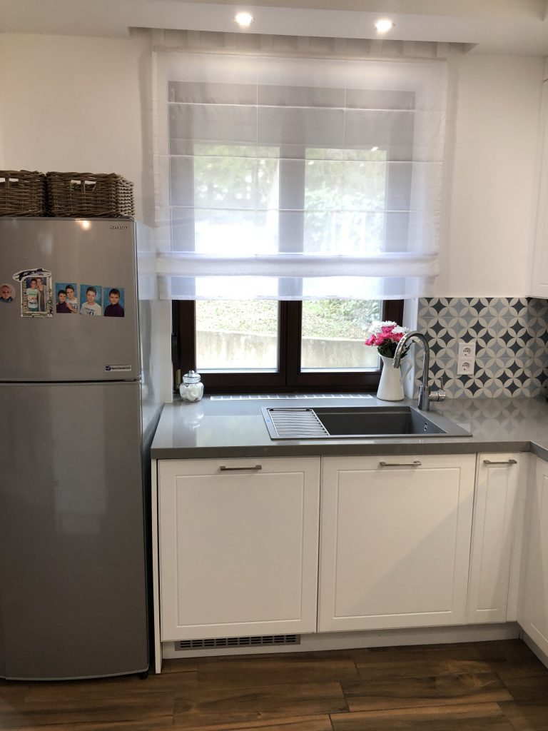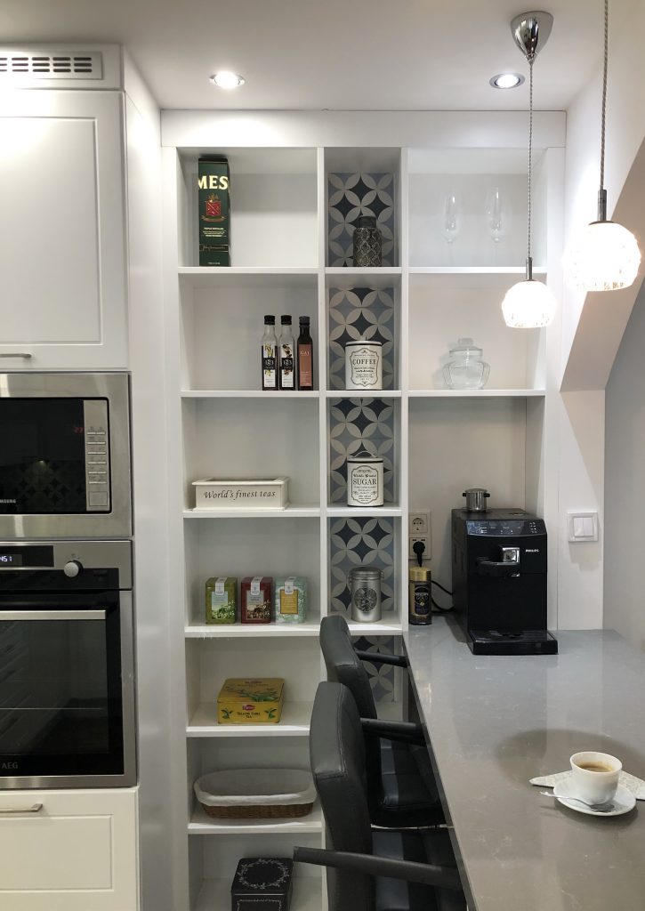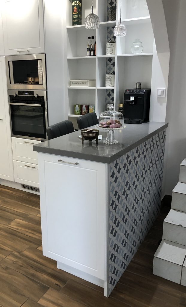 Egy konyha-étkező felújítása volt a feladat. Az ügyfelek egy időtlen, klasszikusba hajló stílust kértek, fehér keretbetétes frontokkal, cementlap mintájú fali lapokkal. A tulajdonosok hidegburkolatot kértek ebbe a térbe, de hogy ne legyen nagyon rideg fahatású burkolatot választottunk. Továbbá tapétát használtam az étkezőbe, egyrészt mert imádom őket, másrészt hogy ez is lágyítsa, szobaszerűbbé tegye az étkezőrészt. 2 macska is tartozik a családhoz, ezért miattuk nem lehetett földig engedni a tapétát, mert lekarmolták volna. Egy klasszikus, keretes falipanel került ide védőfelületnek, és a tapéta csak erről indult felfelé.