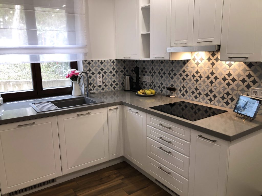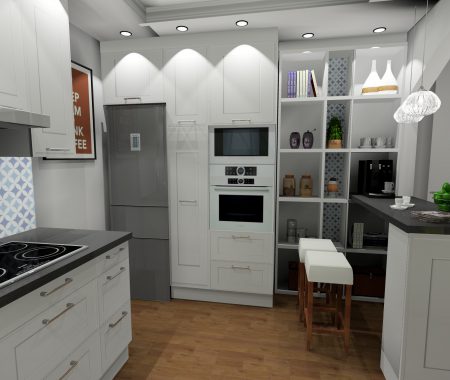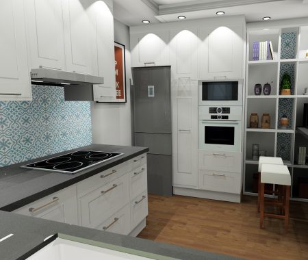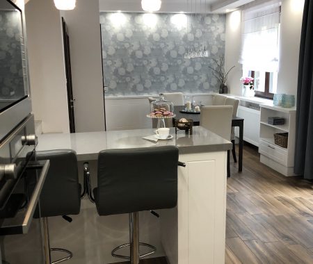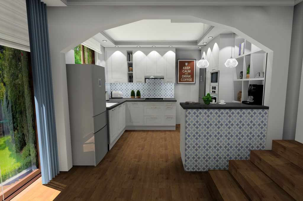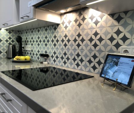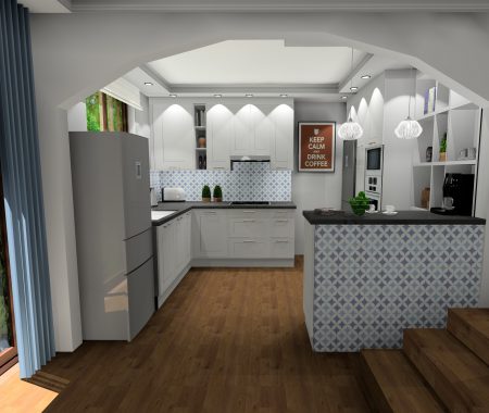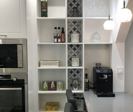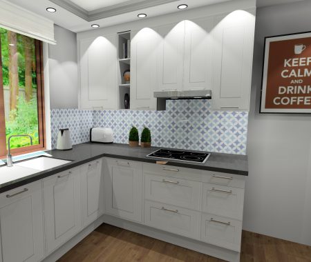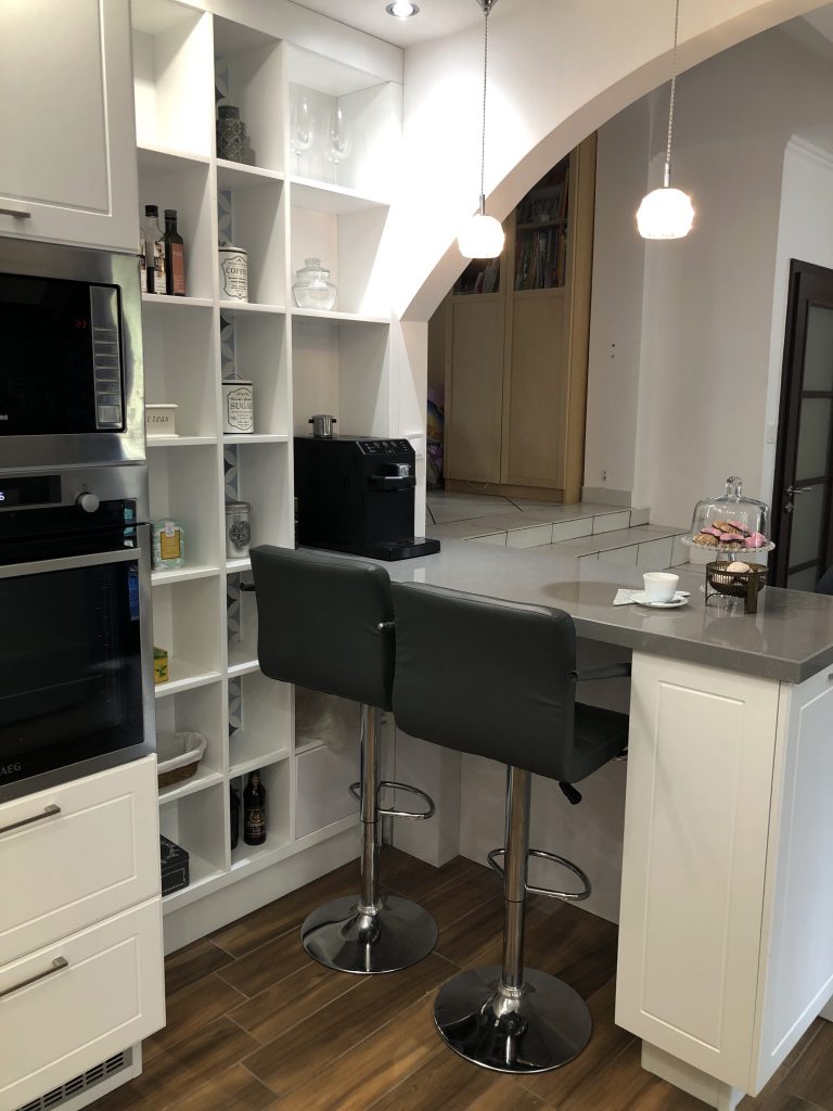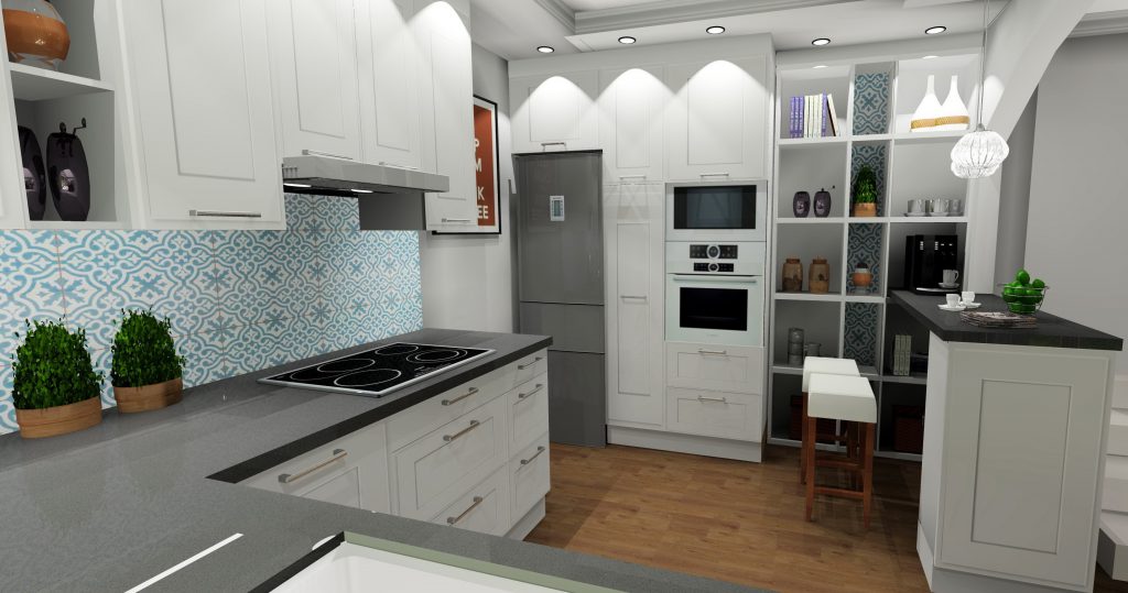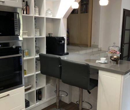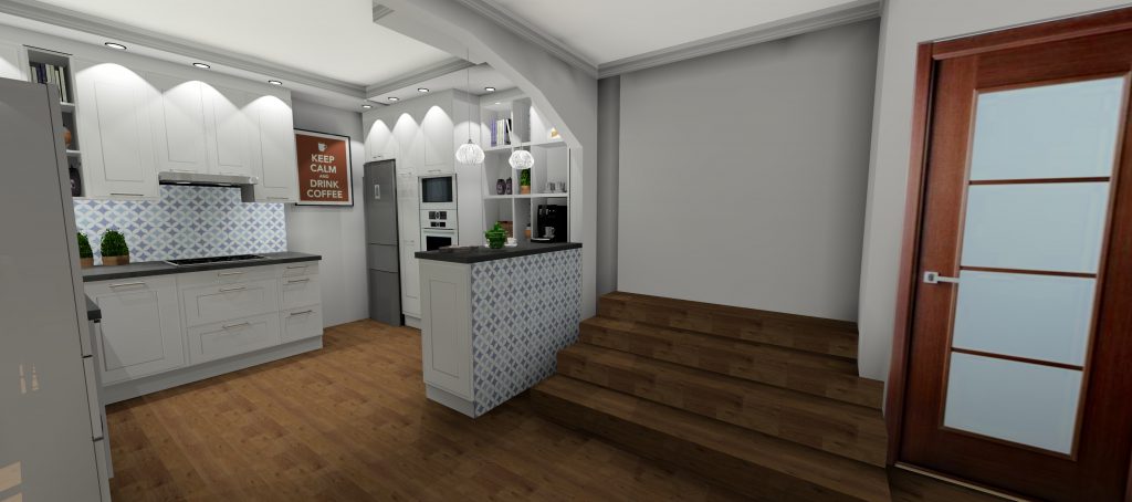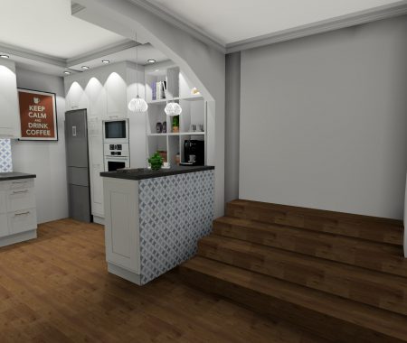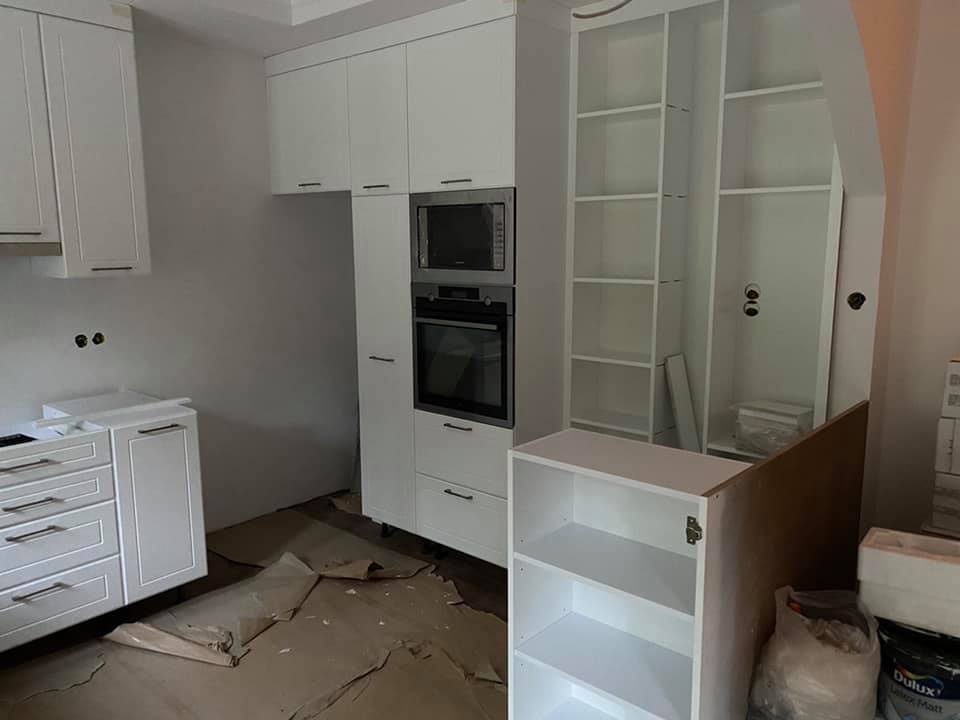 Egy konyha-étkező felújítása volt a feladat. Az ügyfelek egy időtlen, klasszikusba hajló stílust kértek, fehér keretbetétes frontokkal, cementlap mintájú fali lapokkal. A tulajdonosok hidegburkolatot kértek ebbe a térbe, de hogy ne legyen nagyon rideg fahatású burkolatot választottunk. Továbbá tapétát használtam az étkezőbe, egyrészt mert imádom őket, másrészt hogy ez is lágyítsa, szobaszerűbbé tegye az étkezőrészt. 2 macska is tartozik a családhoz, ezért miattuk nem lehetett földig engedni a tapétát, mert lekarmolták volna. Egy klasszikus, keretes falipanel került ide védőfelületnek, és a tapéta csak erről indult felfelé.