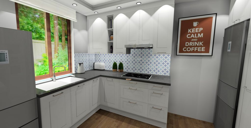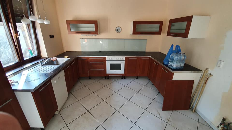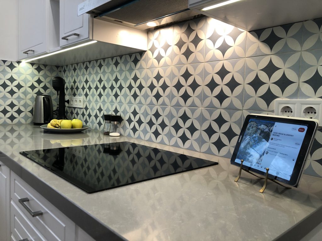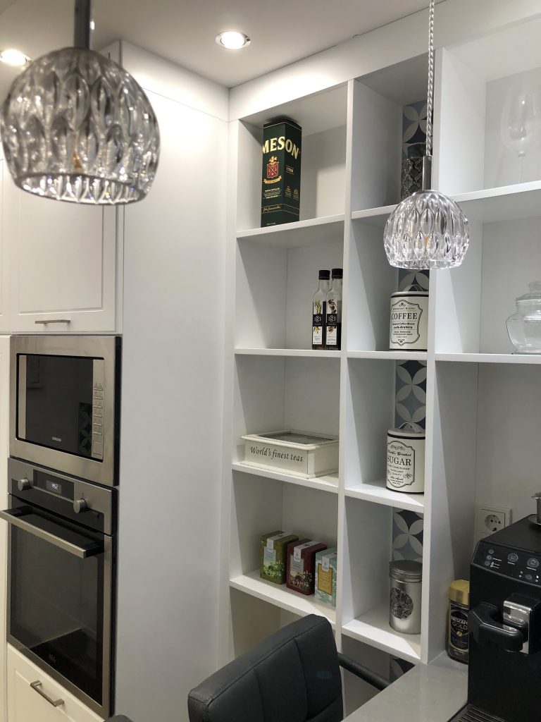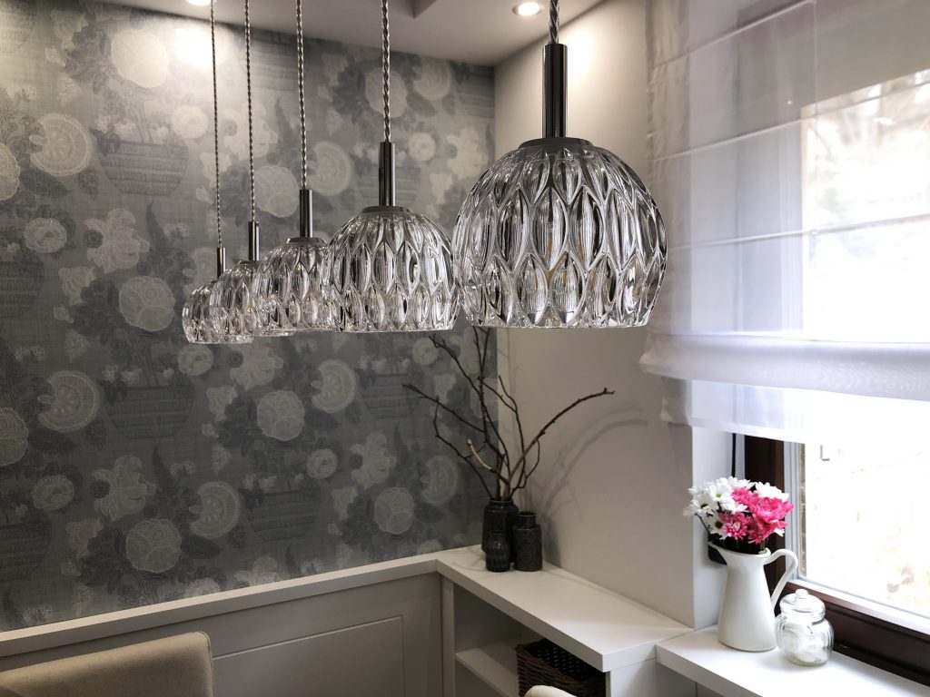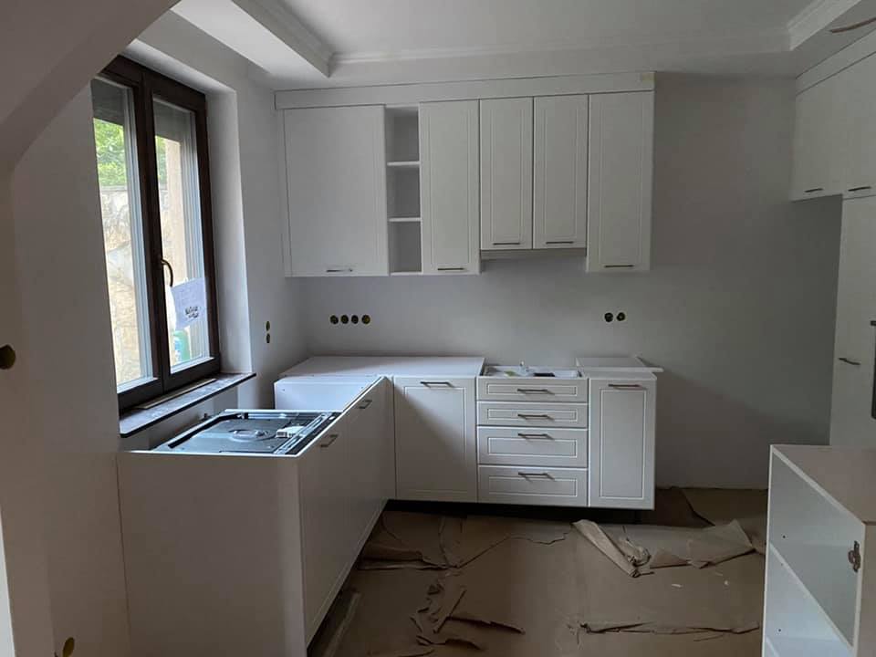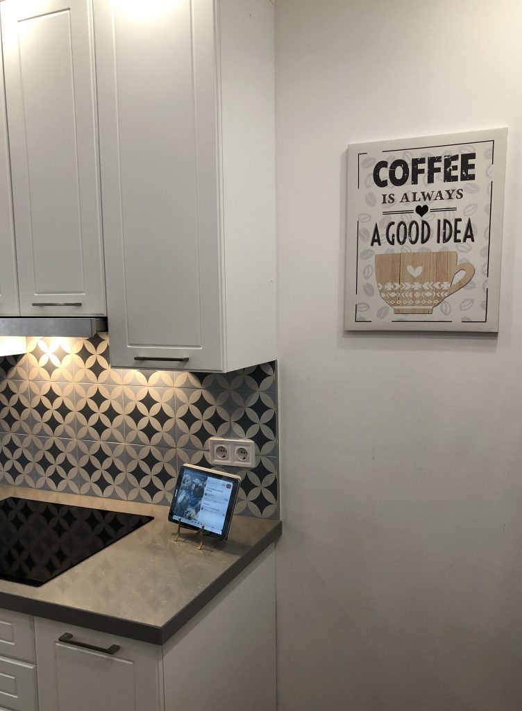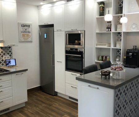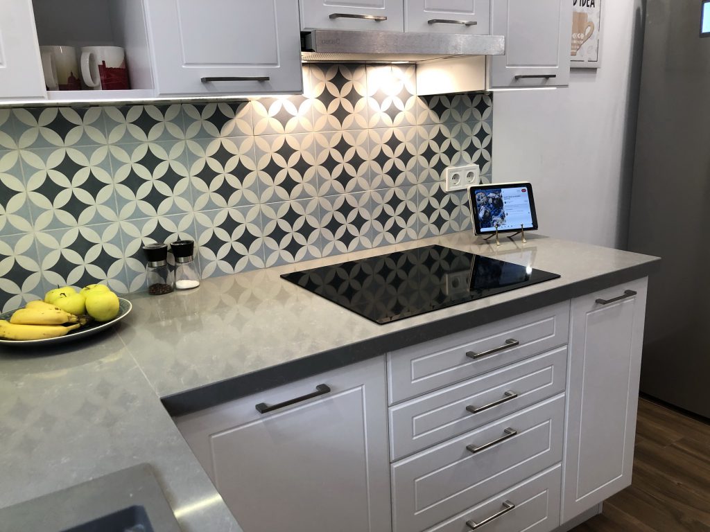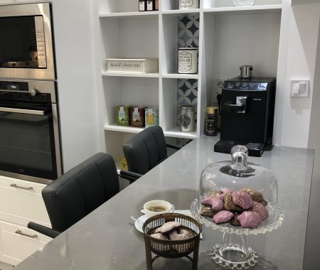 Egy konyha-étkező felújítása volt a feladat. Az ügyfelek egy időtlen, klasszikusba hajló stílust kértek, fehér keretbetétes frontokkal, cementlap mintájú fali lapokkal. A tulajdonosok hidegburkolatot kértek ebbe a térbe, de hogy ne legyen nagyon rideg fahatású burkolatot választottunk. Továbbá tapétát használtam az étkezőbe, egyrészt mert imádom őket, másrészt hogy ez is lágyítsa, szobaszerűbbé tegye az étkezőrészt. 2 macska is tartozik a családhoz, ezért miattuk nem lehetett földig engedni a tapétát, mert lekarmolták volna. Egy klasszikus, keretes falipanel került ide védőfelületnek, és a tapéta csak erről indult felfelé.
