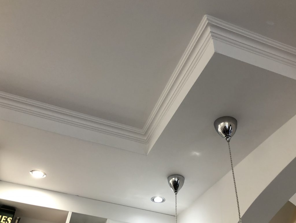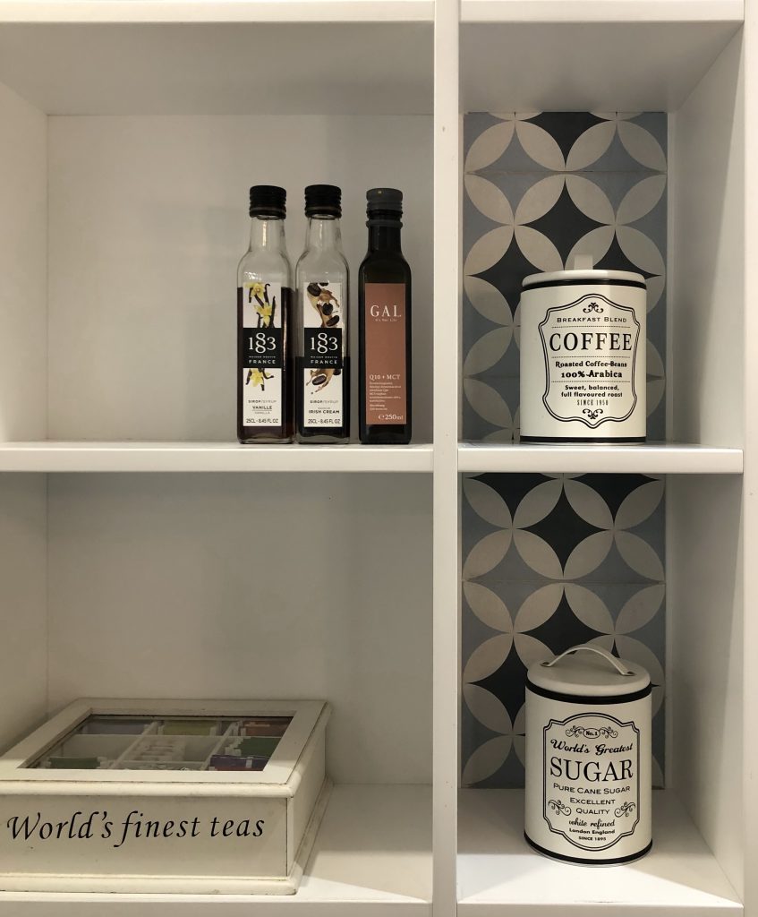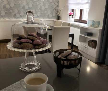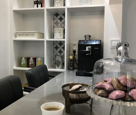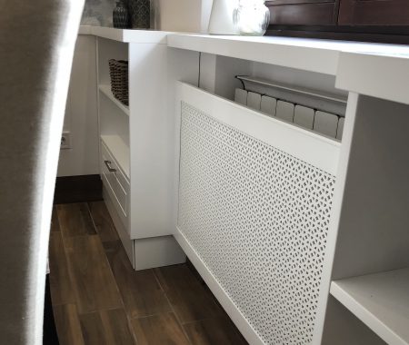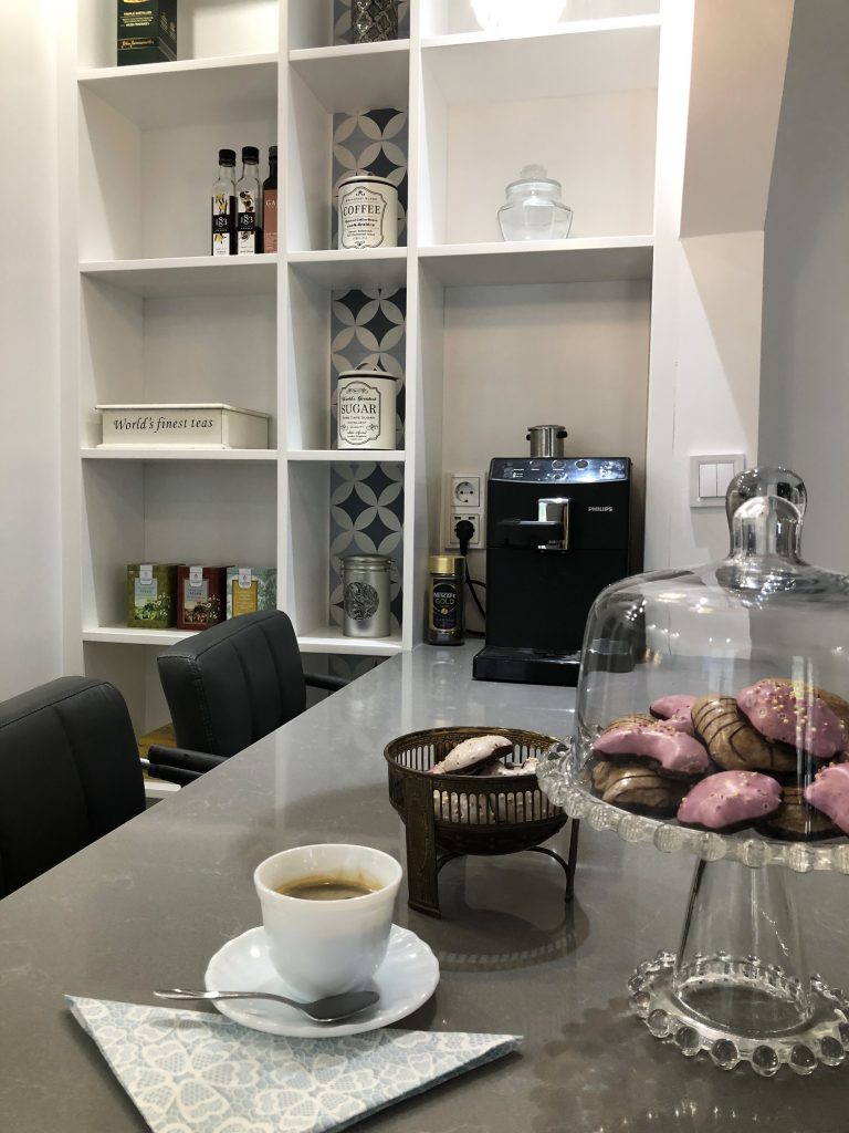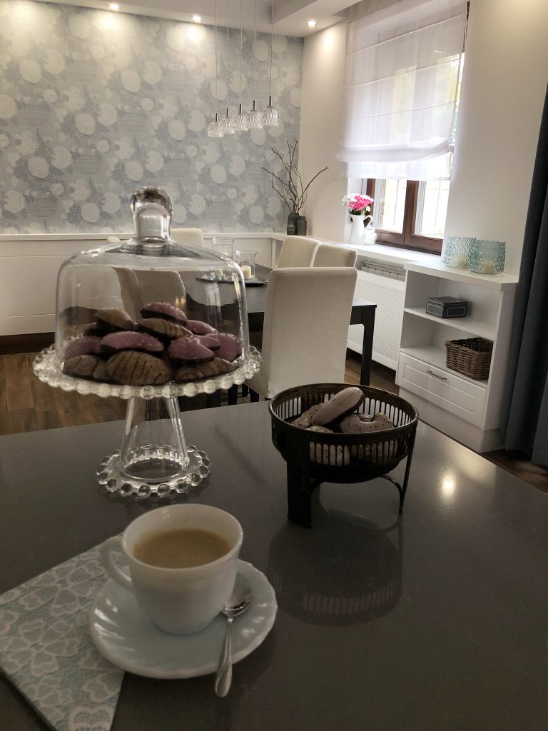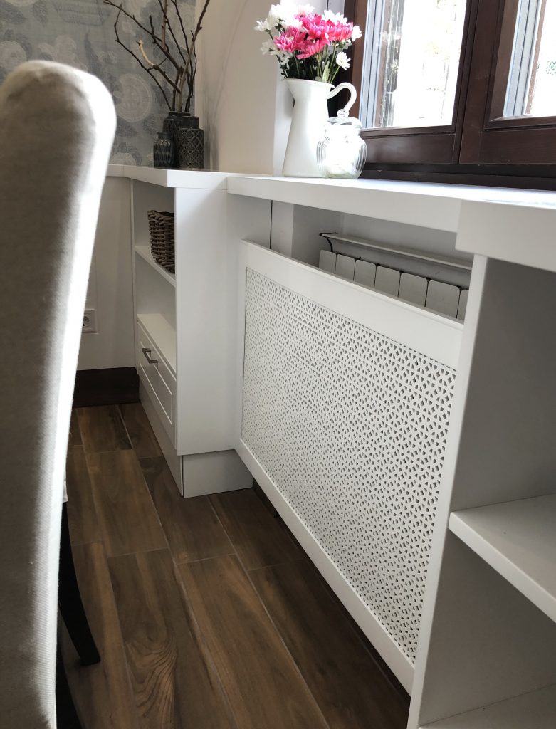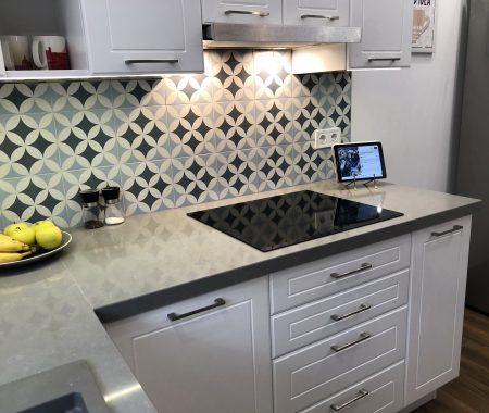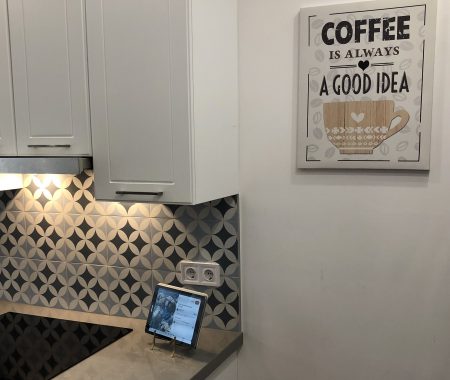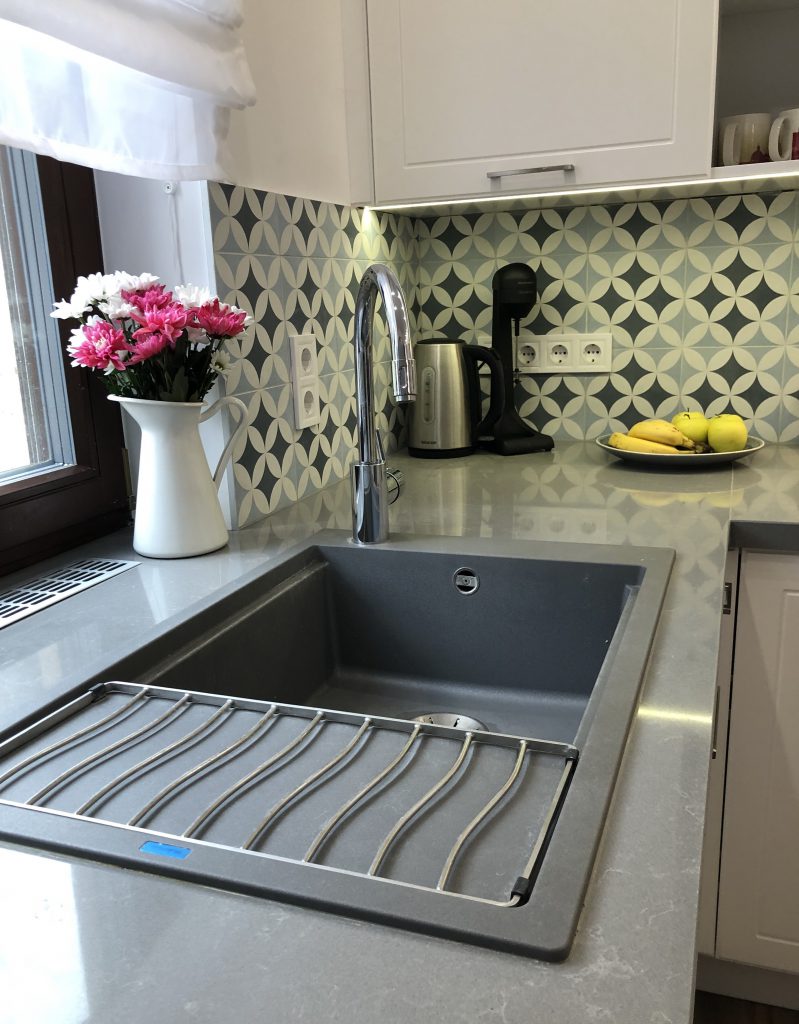 Egy konyha-étkező felújítása volt a feladat. Az ügyfelek egy időtlen, klasszikusba hajló stílust kértek, fehér keretbetétes frontokkal, cementlap mintájú fali lapokkal. A tulajdonosok hidegburkolatot kértek ebbe a térbe, de hogy ne legyen nagyon rideg fahatású burkolatot választottunk. Továbbá tapétát használtam az étkezőbe, egyrészt mert imádom őket, másrészt hogy ez is lágyítsa, szobaszerűbbé tegye az étkezőrészt. 2 macska is tartozik a családhoz, ezért miattuk nem lehetett földig engedni a tapétát, mert lekarmolták volna. Egy klasszikus, keretes falipanel került ide védőfelületnek, és a tapéta csak erről indult felfelé.