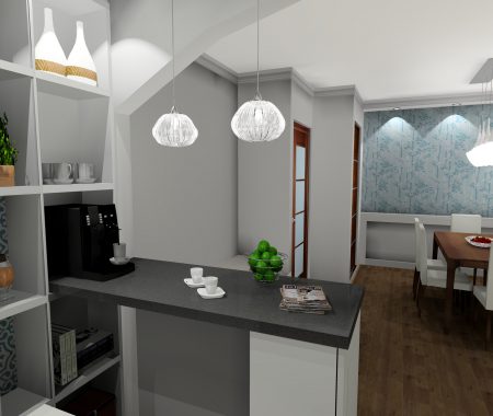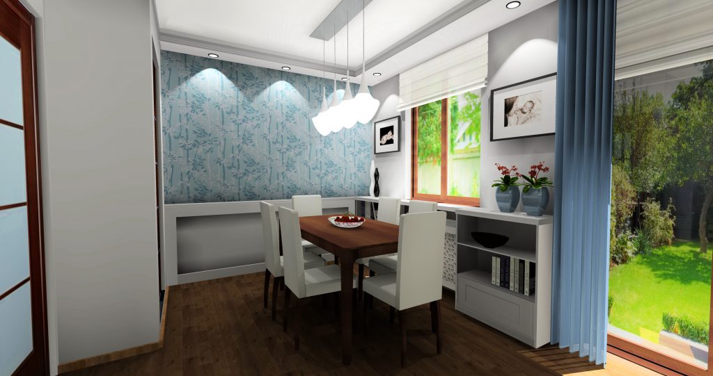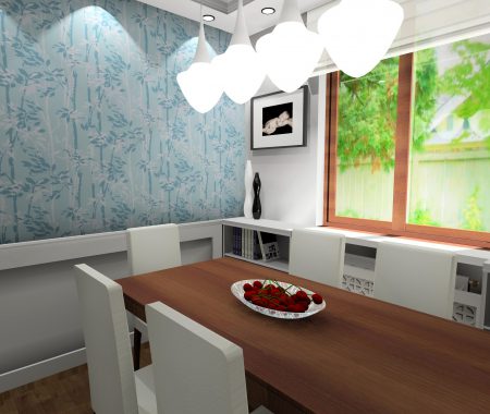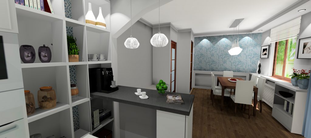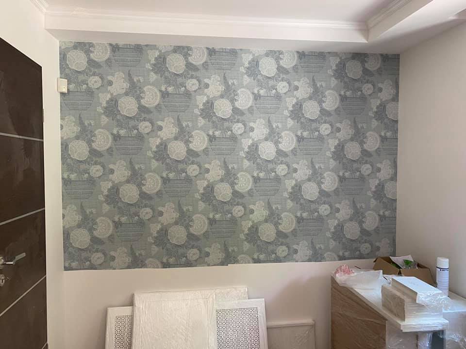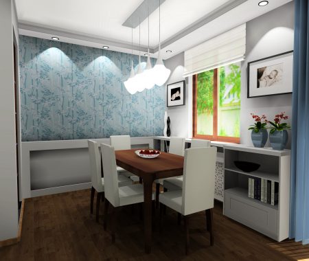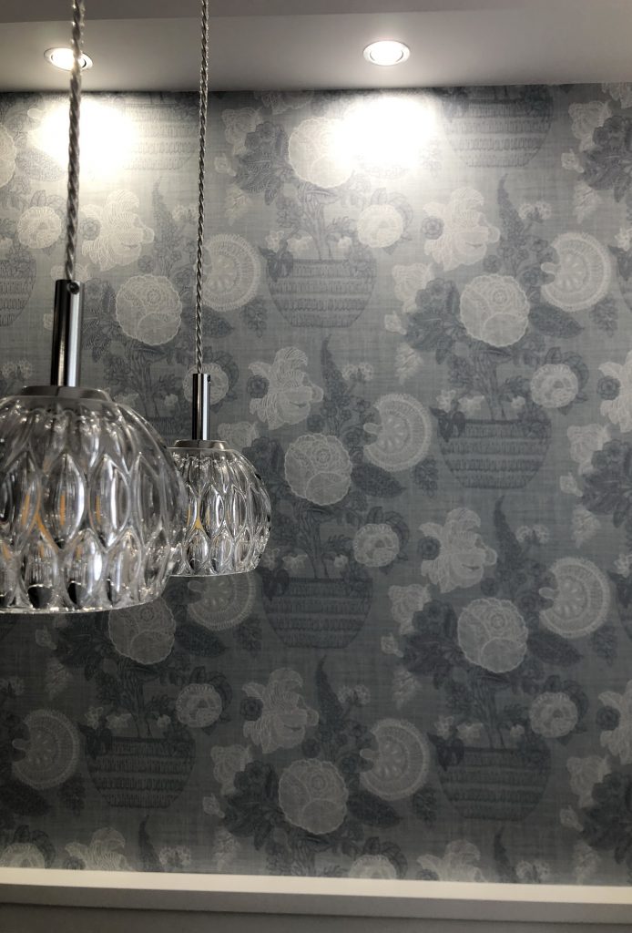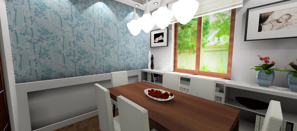 A kivitelezés nagyon terveknek megfelelően haladt, egyedül a tapéta tér el a látványtervektől, mert a válogatásnál első látásra beleszerettünk ebbe a finom rajzolatú, halványkék tekercsbe.