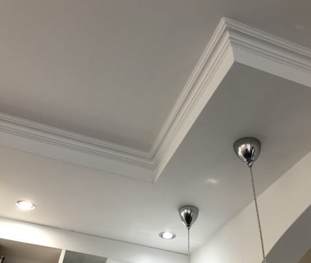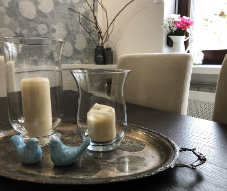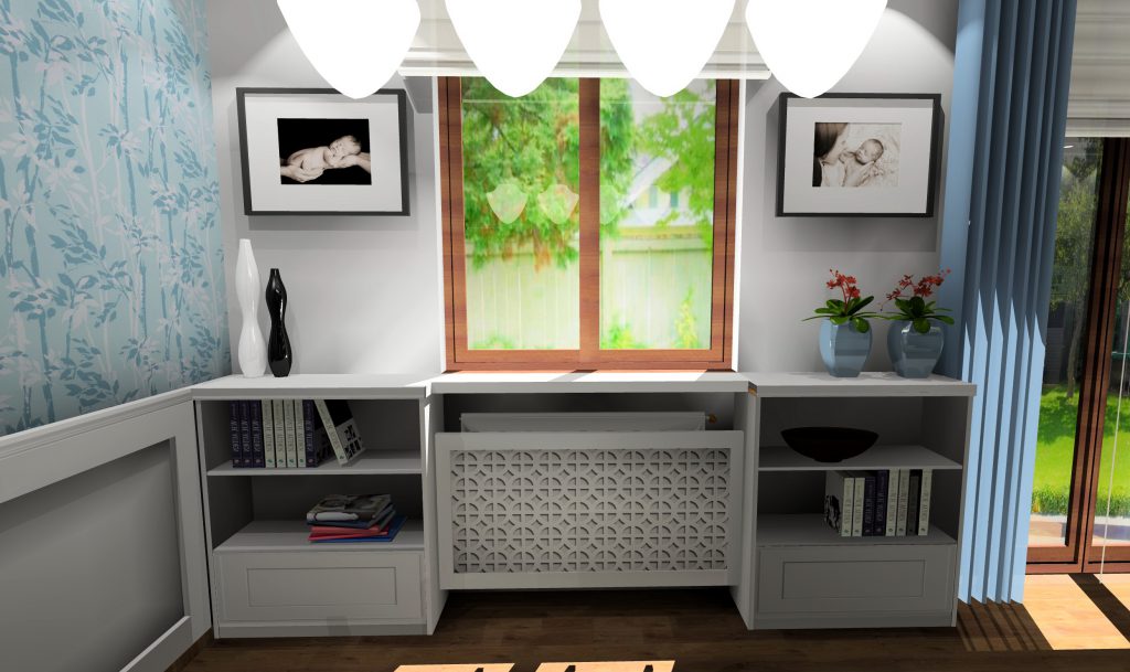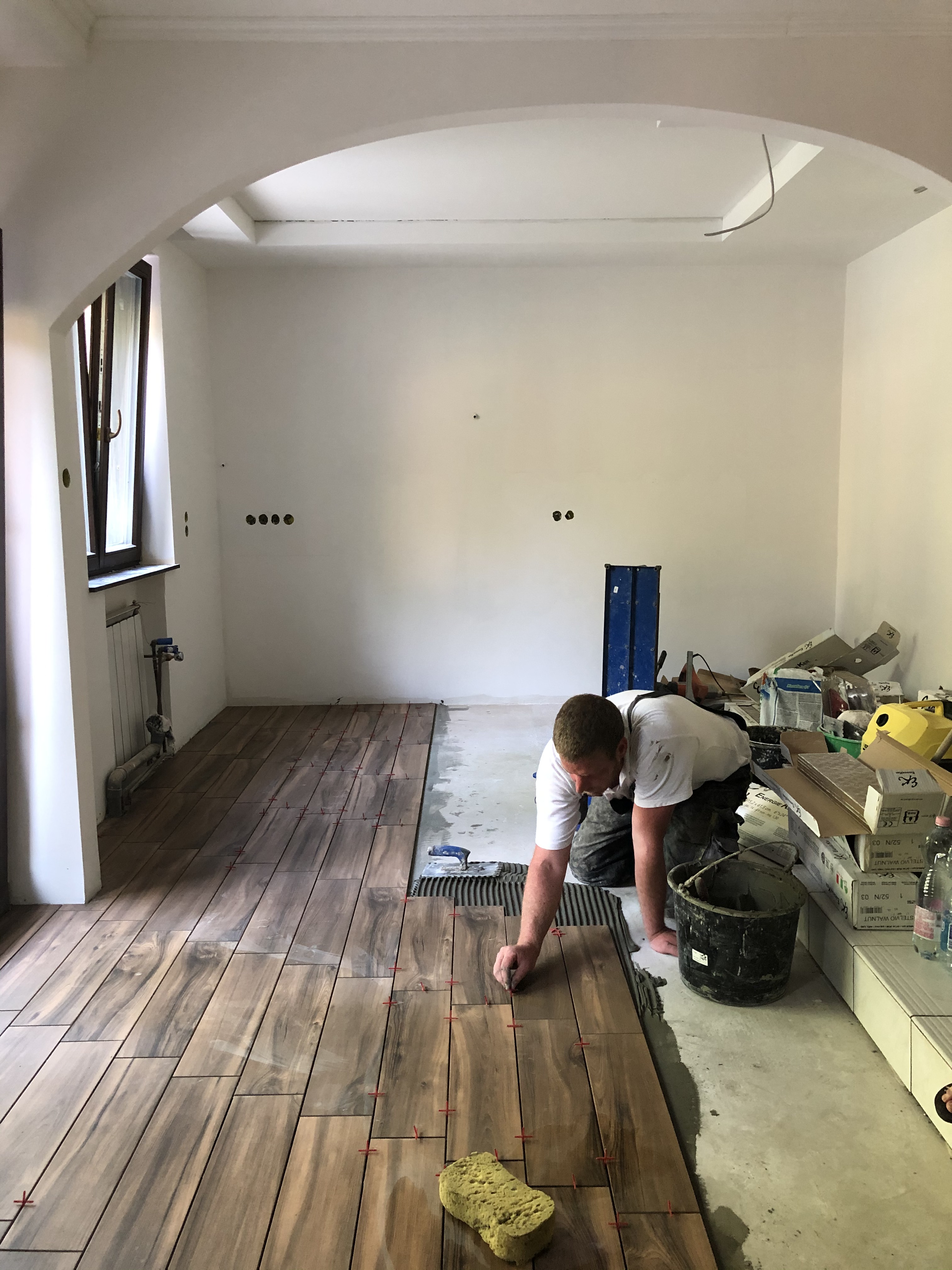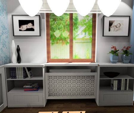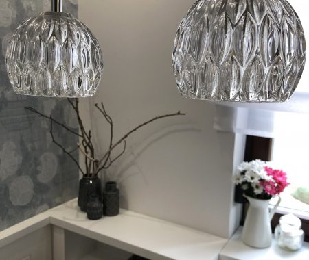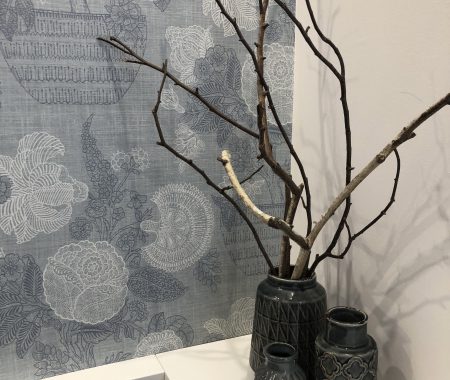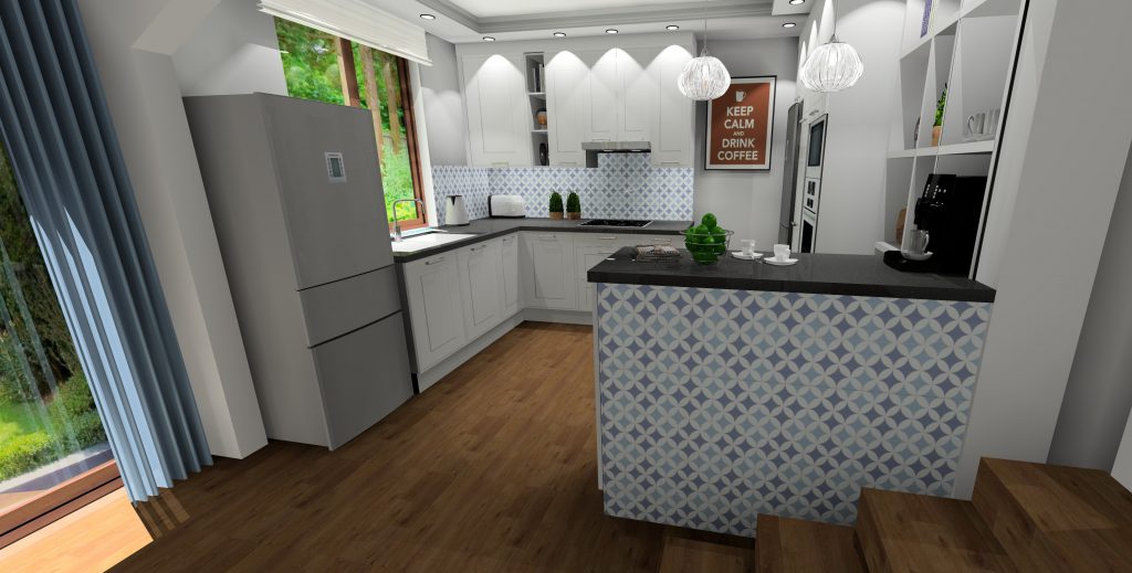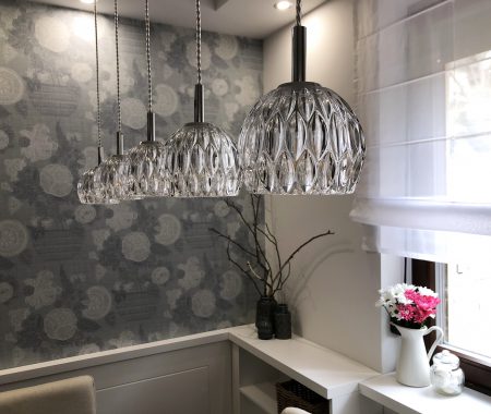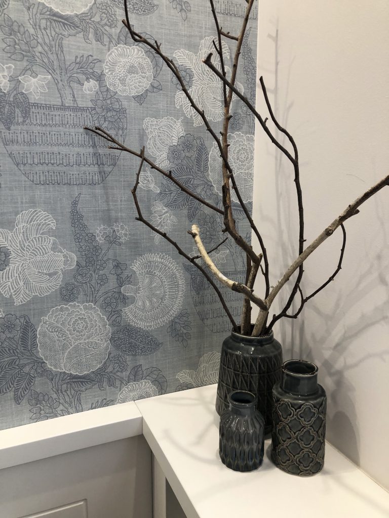 A kivitelezés nagyon terveknek megfelelően haladt, egyedül a tapéta tér el a látványtervektől, mert a válogatásnál első látásra beleszerettünk ebbe a finom rajzolatú, halványkék tekercsbe.