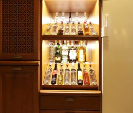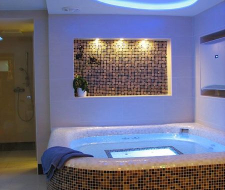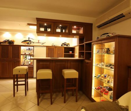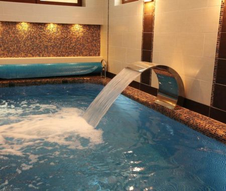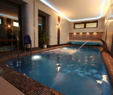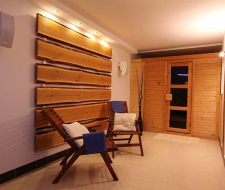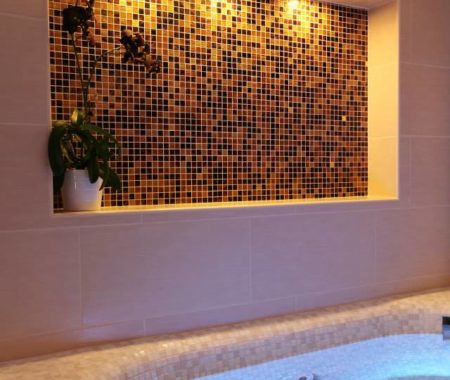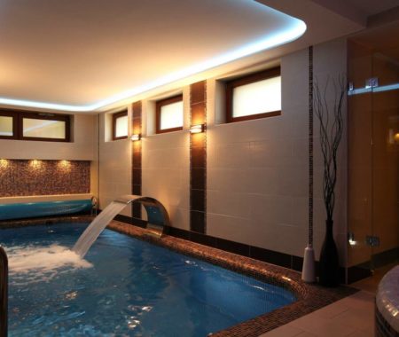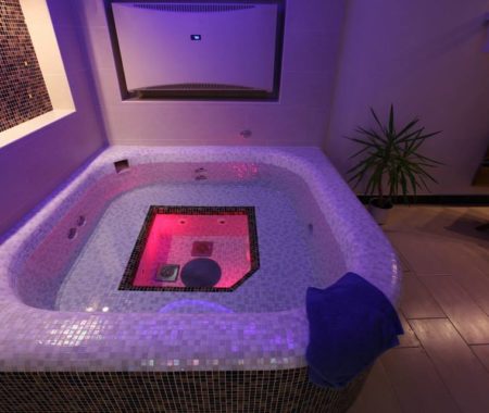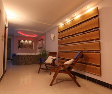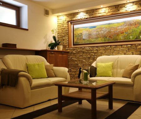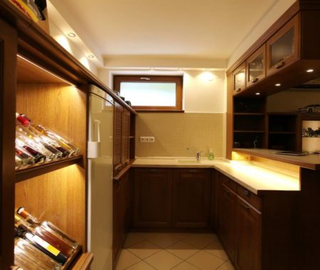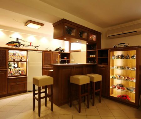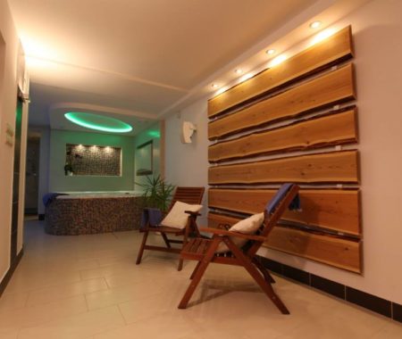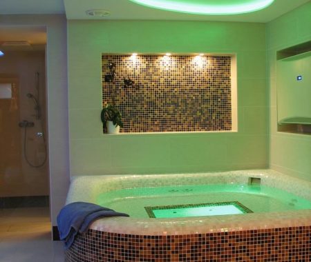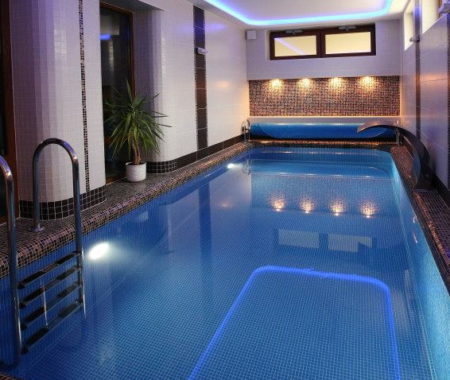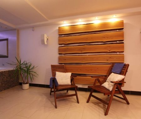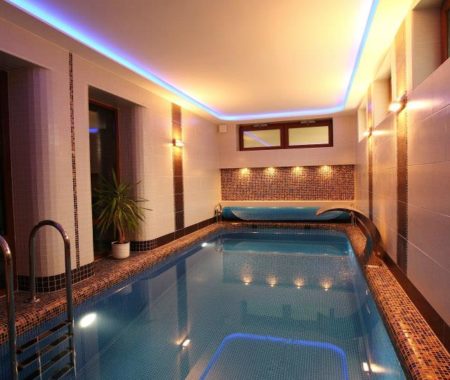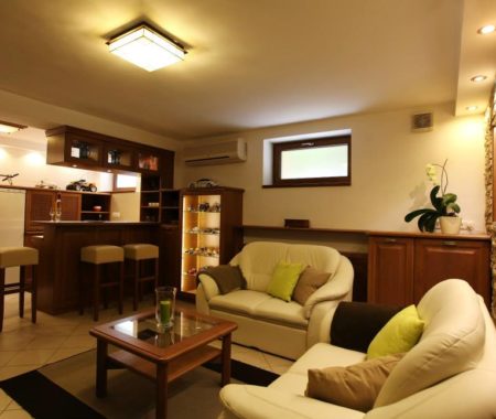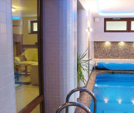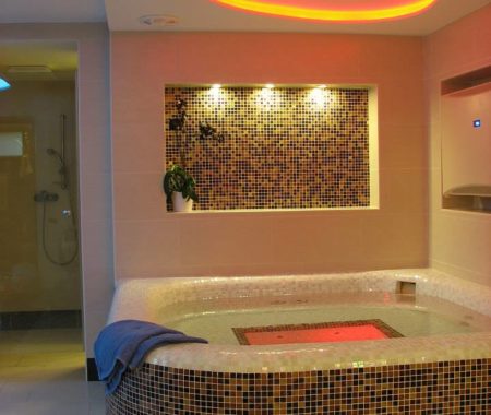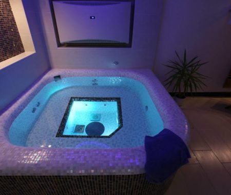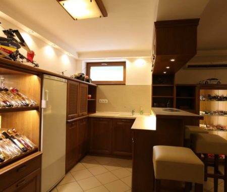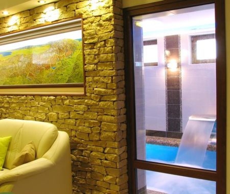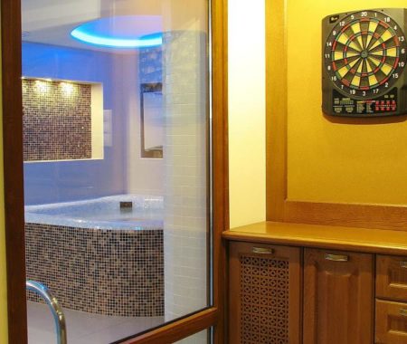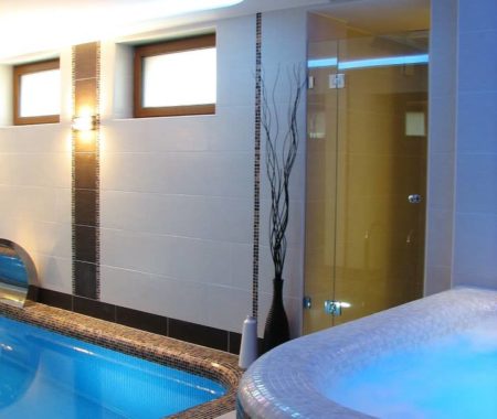 Egy alagsort kellett átalakítanom wellness-pihenő térré. Eredetileg is volt az egyik térrészben egy medence, de ahogy alább a munkafolyamatoknál is látszik, nem volt megfelelő és hangulatos. Alacsony belmagasság és szűk terek; ezt kellett valahogy kijátszanom, elsősorban a burkolatok optikai játékával. A wellness hangulatot pedig a mozaikok és a mennyezeti dobozolásba elhelyezett színterápiás fények teremtik meg. A vizes térben uszoda, jakuzzi és szauna található, a pihenő részben bár rész, pálinkakínálóval, biliárd és darts.