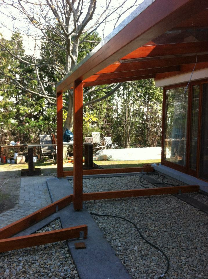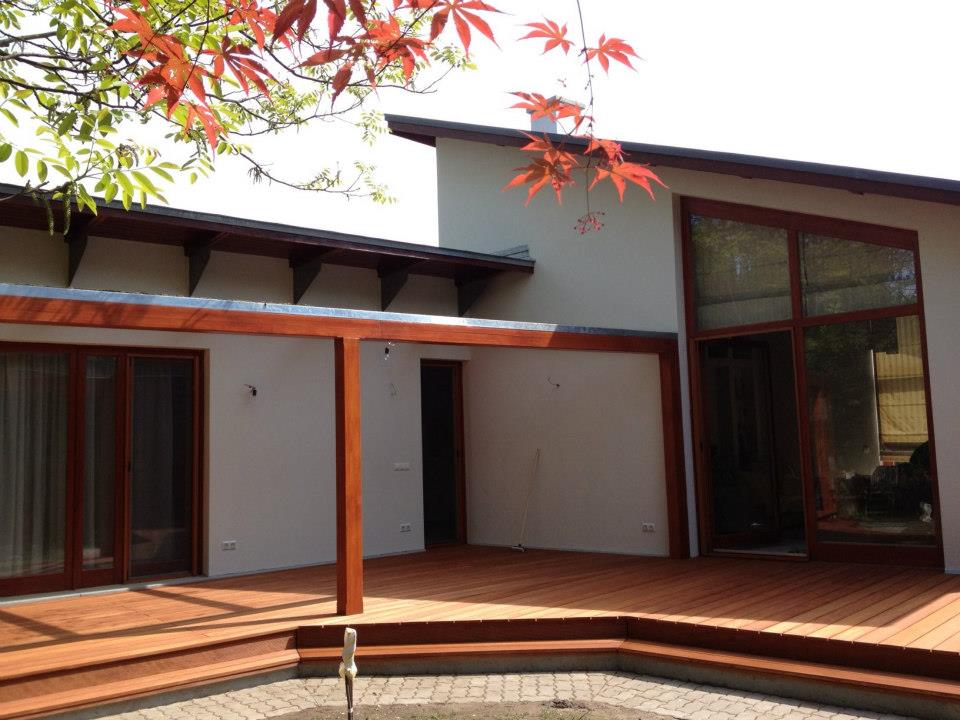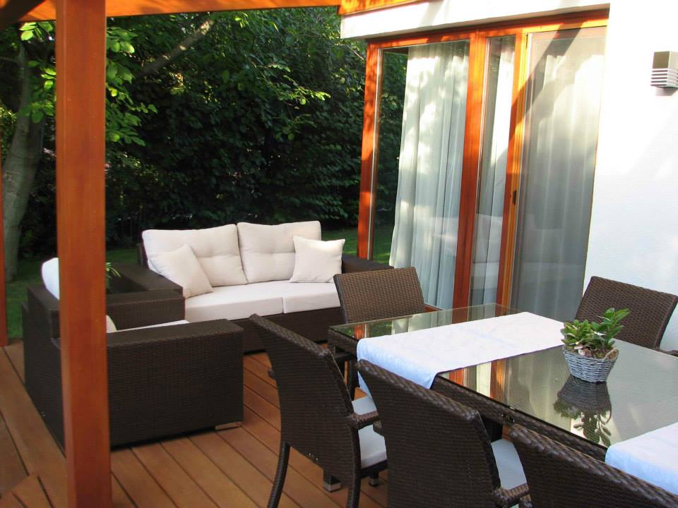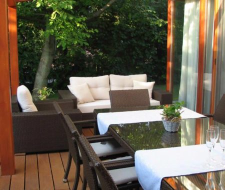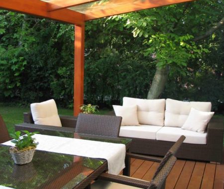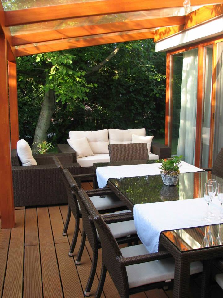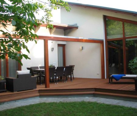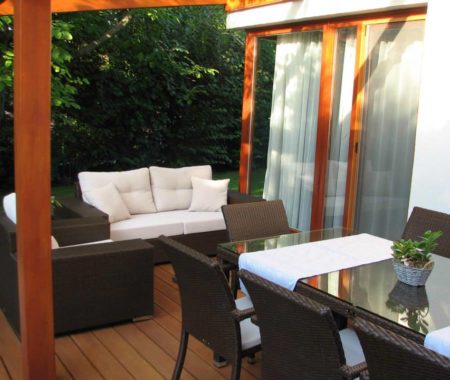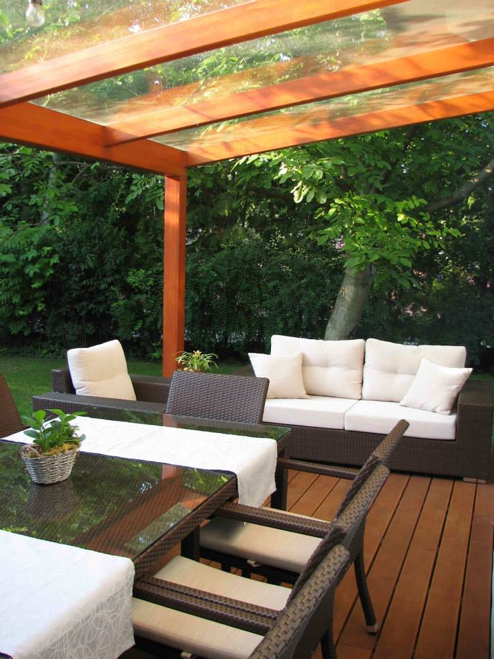 Egy modern vonalú ház hátsó kertjében kellett egy, az épület stílusához igazodó teraszt terveznem. A megrendelő világos, de szél és eső védett kerti helyiséget szeretett volna, ezért hatalmas üvegtáblákkal fedtük le a tetőszerkezetet. Az L alakú terasznak csak az egyik része fedett, a másik a napozó terület. Az ügyfelek nagyon szeretik az új kerti pihenőt, tavasztó őszig használják napi szinten.