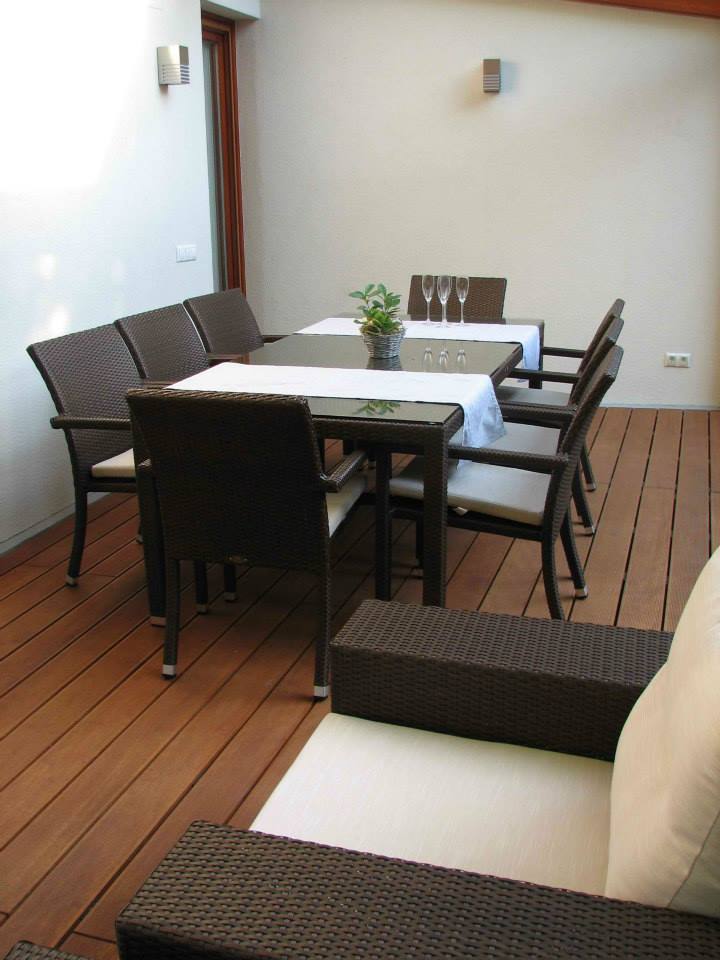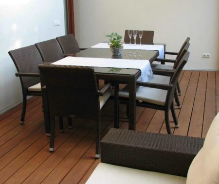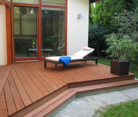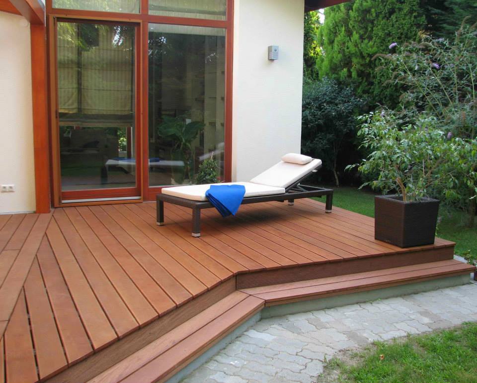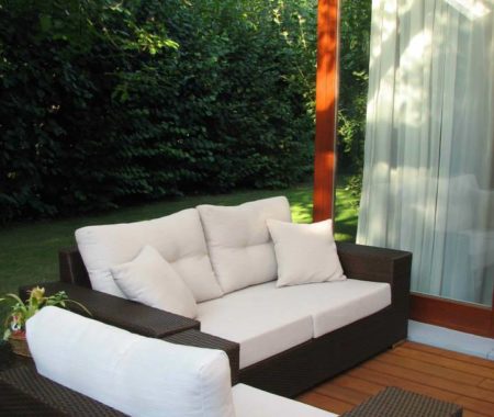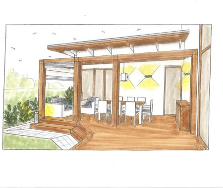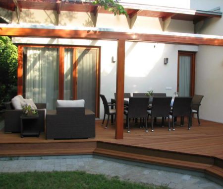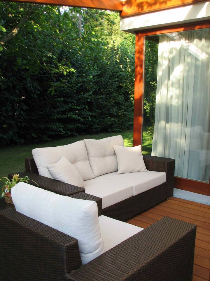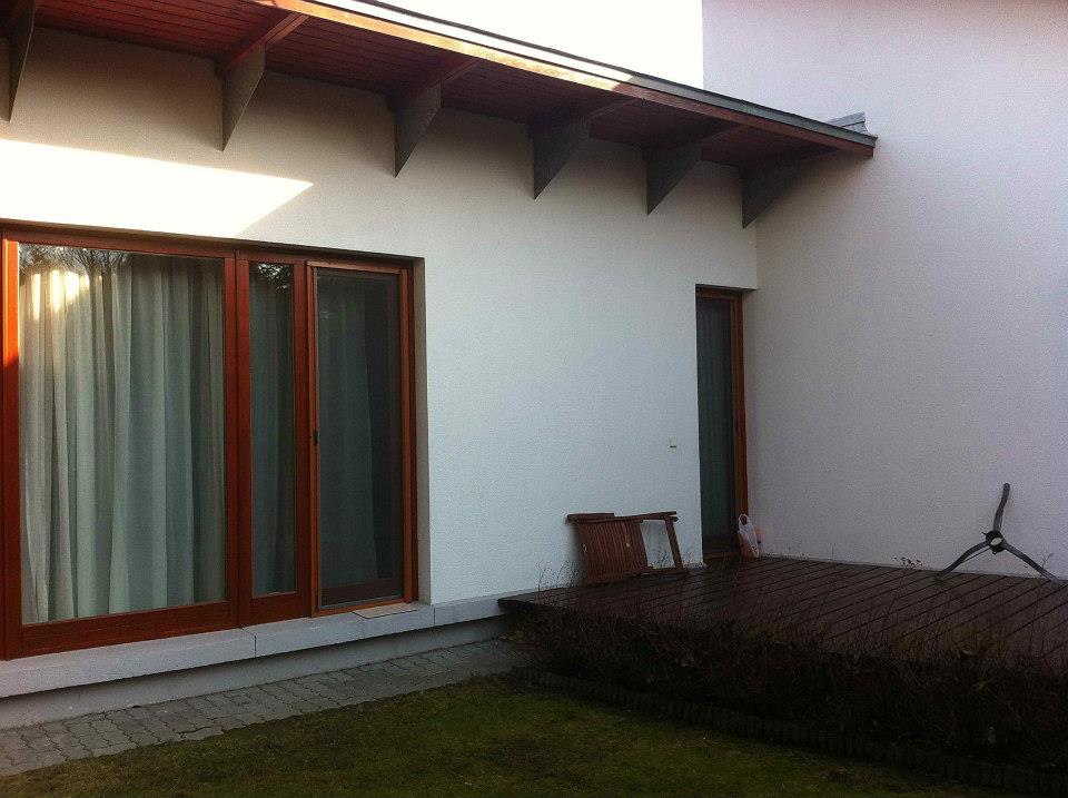 Egy modern vonalú ház hátsó kertjében kellett egy, az épület stílusához igazodó teraszt terveznem. A megrendelő világos, de szél és eső védett kerti helyiséget szeretett volna, ezért hatalmas üvegtáblákkal fedtük le a tetőszerkezetet. Az L alakú terasznak csak az egyik része fedett, a másik a napozó terület. Az ügyfelek nagyon szeretik az új kerti pihenőt, tavasztó őszig használják napi szinten.